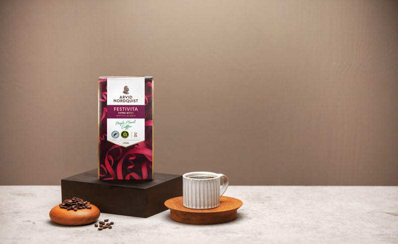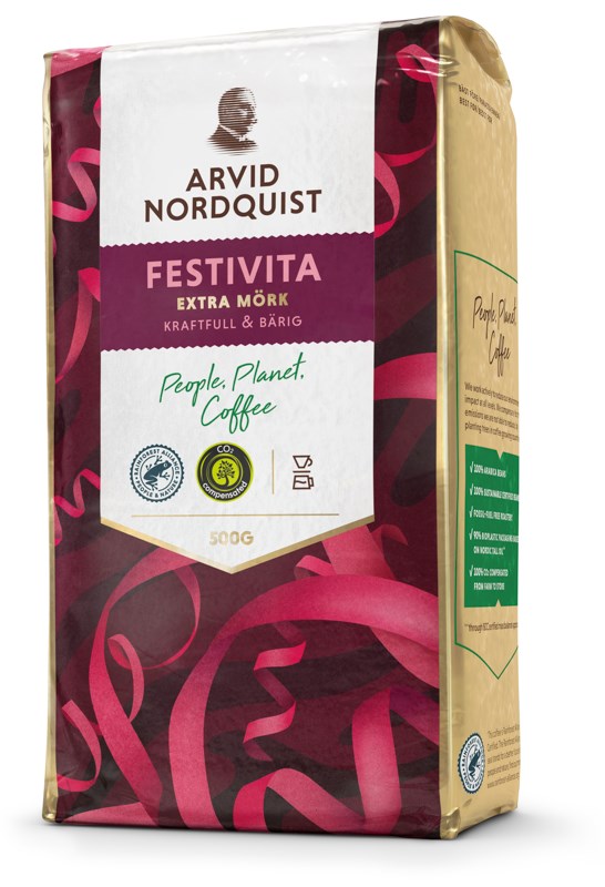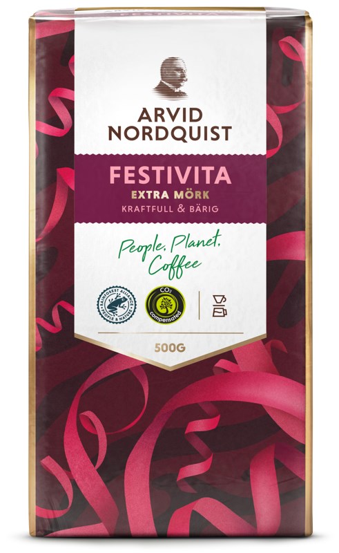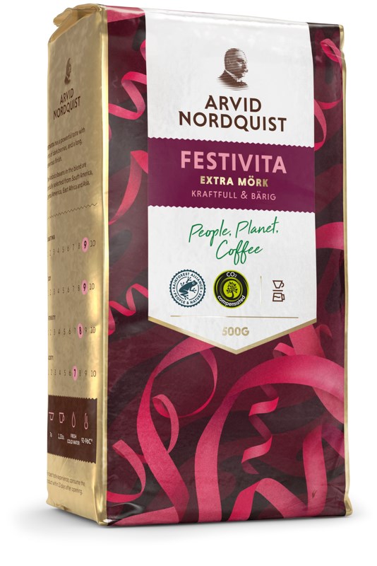 Arvid Nordquist Festivita är ett kraftfullt och smakrikt kaffe med en fyllig karaktär och inslag av mörka bär. Den extra mörka rostningen ger kaffet en intensiv arom och en lång, generös eftersmak med toner av mörk choklad och björnbär. Festivita är framtaget för dig som uppskattar ett kaffe med djup och kraft, men samtidigt en elegant balans mellan fyllighet och syrlighet. Kaffet består av 100% Arabicabönor av högsta kvalitet, rostas helt fossilfritt och är certifierat av Rainforest Alliance för ett hållbart jordbruk och goda arbetsvillkor.