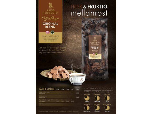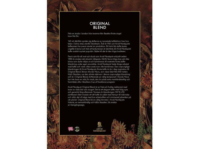 Arvid Nordquist Original Blend är ett klassiskt mellanmörkrostat kaffe med elegant och frisk karaktär. Smaken är rund och nötig med en generöst lång, frisk eftersmak. Bönorna är 100% Arabicabönor, odlade på hög höjd där de får mogna långsamt för optimal smakutveckling. Frukten plockas normalt för hand och bearbetas varsamt för att bevara bönornas naturliga arom och kvalitet. Ett balanserat och friskt kaffe som passar perfekt för såväl morgonkoppen som eftermiddagens fika.