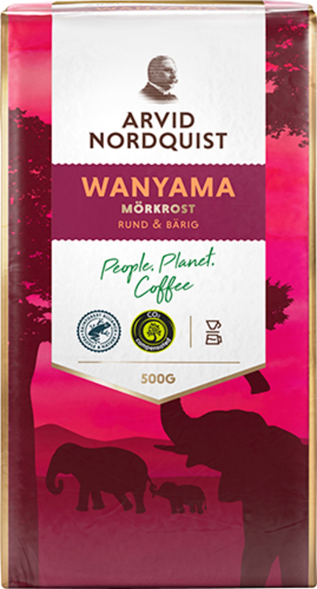 Mörkrost – Bärig & Mustig. Wanyama (djur på swahili) är en hyllning till vilda djur i allmänhet och den afrikanska elefanten i synnerhet. Den mörkrostade afrikanska blenden ger Wanyama dess bäriga smak, och tillsammans med den mustiga aromen får du en upplevelse av den afrikanska vildmarken. Rostat på 100% arabicabönor främst från Afrika och 100% hållbart certifierat via UTZ Certified.Visa mer beskrivningVisa mindre beskrivning -