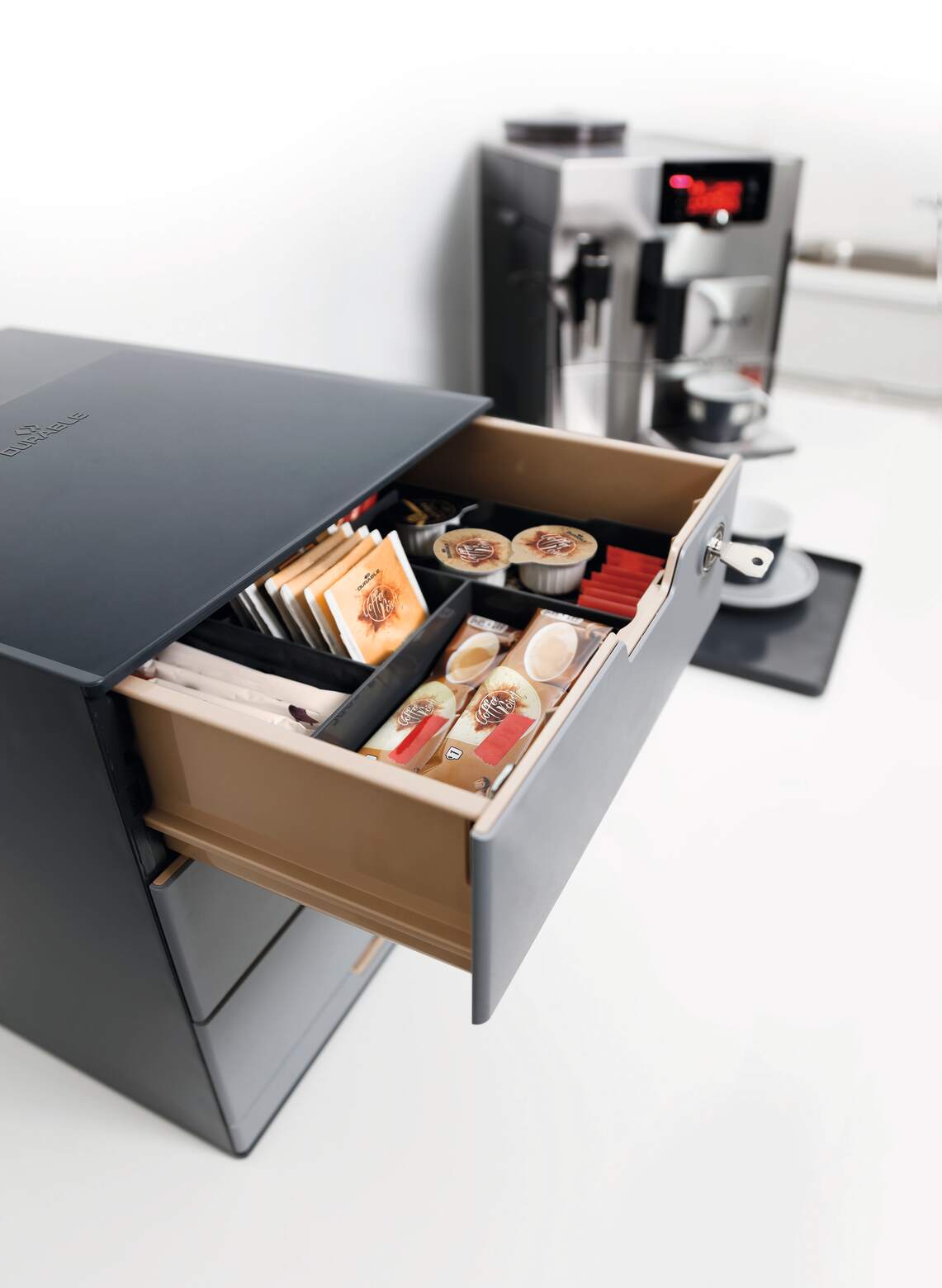 Den modulära förvaringslådan med fyra lådor är utformad för organiserad och tydlig förvaring av cateringtillbehör. Den ger ordning bland kaffekapslar, sockerpåsar, rörpinnar, servetter och andra tillbehör, samtidigt som den skyddar kaffe- och tepads från ljus och fukt. Konstruktionen står stabilt tack vare gummifötterna och är perfekt för användning i kokvrår, loungeområden och mötesrum. Den översta lådan är utrustad med cylinderlås för säker förvaring. Produkten levereras med genomskinliga lådinsatserna CADDY och CASE för smidig sortering.