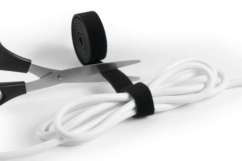Kabelsamlare av 2 cm brett kardborrband som klipps i önskad längd .