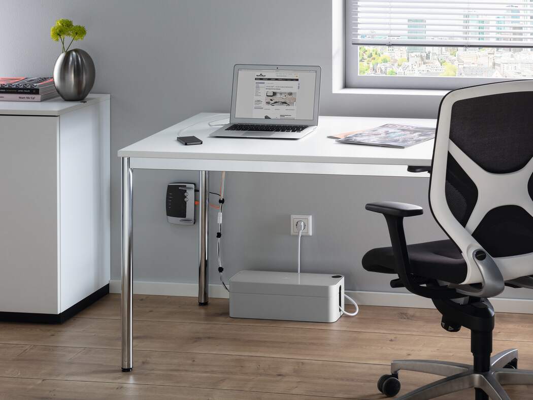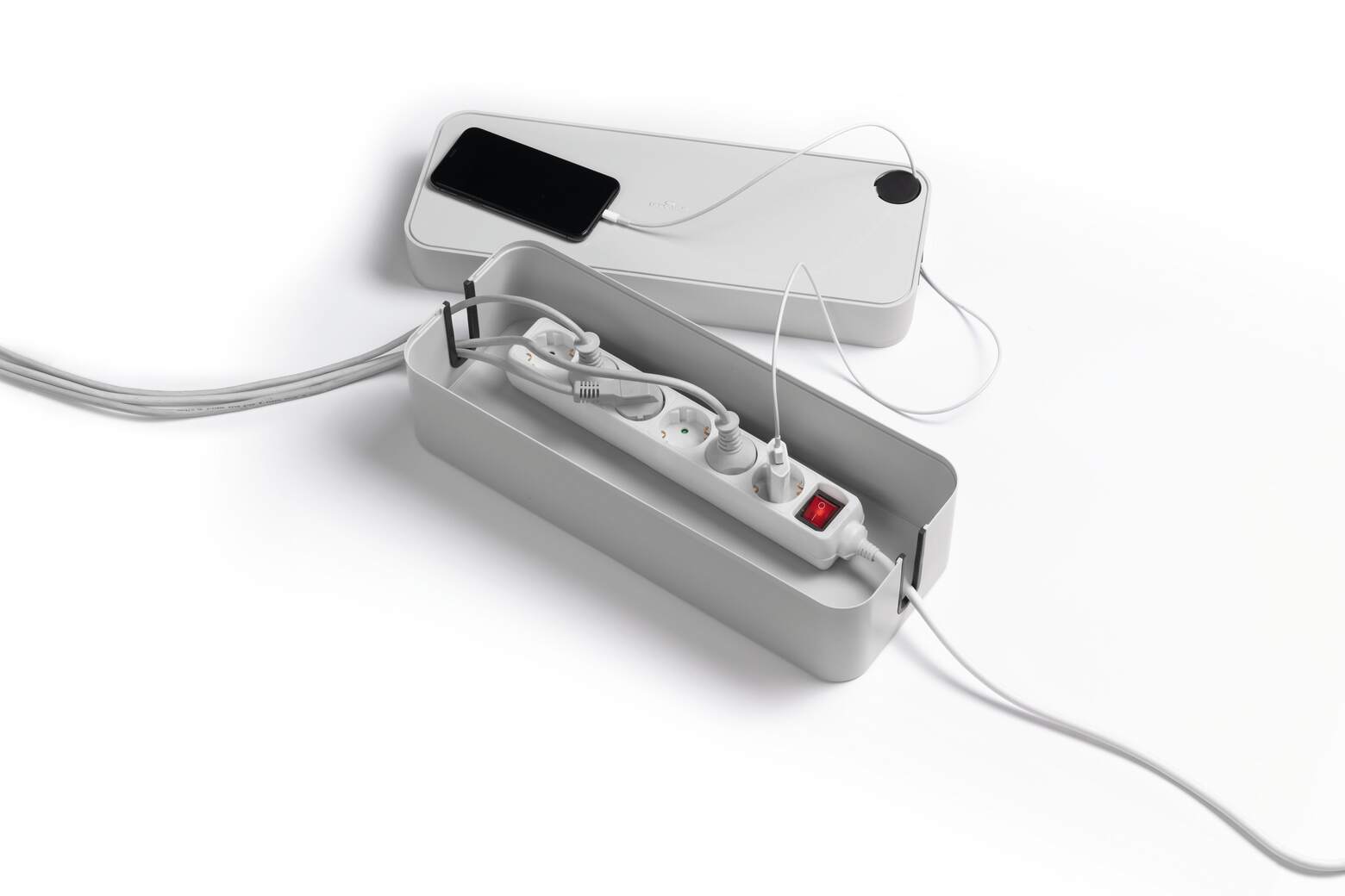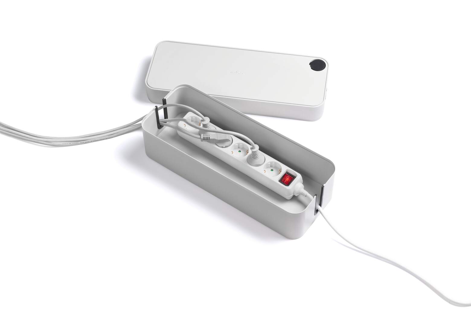 Håll ordning på kablarna med CAVOLINE® både på kontor och i hemmiljö. Samla ihop kablarna så ser det prydligare ut och blir dessutom mer lättstädat. _x000D_Elegant sladdbox av flamsäker plast för kablar och 5-vägs grenuttag_x000D_. Gummiklädda öppningar för kablar på båda kortsidorna. Öppningarna fungerar även som ventilationshål. Lock med praktisk kabelgenomföring för mobilens laddningskabel. Stora gummifötter gör att kabelgömman står stadigt_x000D_. Mått: 406 x 156 x 139 mm (B x H x D)_x000D__x000D_Visa mer beskrivningVisa mindre beskrivning -