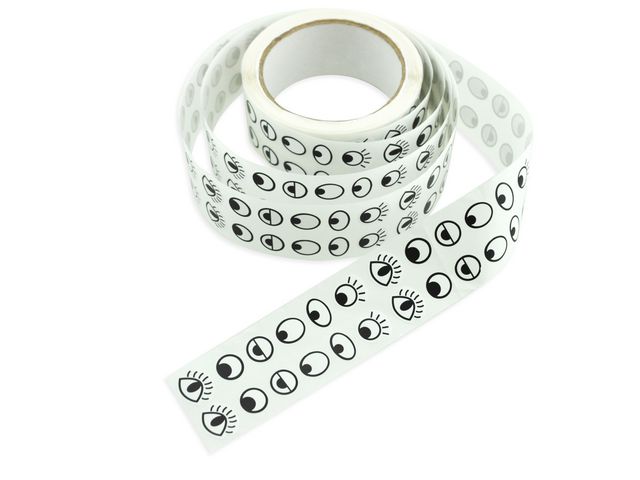 Självhäftande på rulle. Storlek på ögonen är ca 11-19 mm.