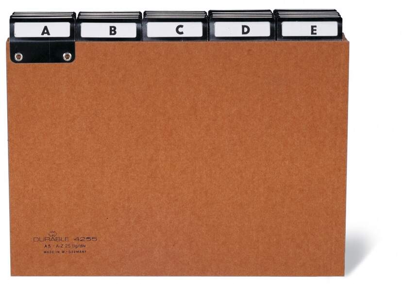 Varumärke Durable EAN 4005546425504 Typ Pärmregister Kategori Arkivvaror Material PVC-U, Stål, Cellulosa, Papper Färg Brun Bredd 21 cm Höjd 15.8 cm Format A5 Ursprungsland Tyskland Utförande Liggande - Produktblad