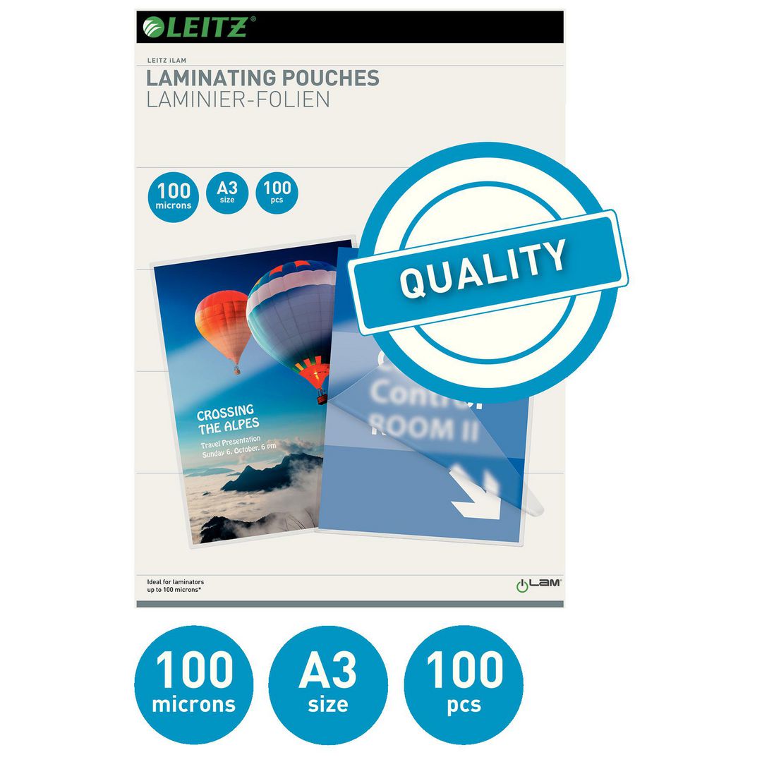 Lamineringsficka Leitz A3 100 micron ger perfekt försegling mot smuts, vätska och fukt. Den blanka ytan förbättrar färgåtergivningen och de rundade kanterna ger en tät, snygg och professionell finish för daglig laminering.