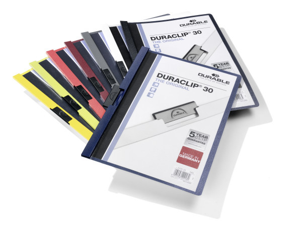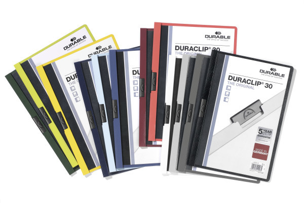 Klämmapp från Durable i serien Duraclip, tillverkad av slitstark plast och utformad för säker och praktisk förvaring av A4-dokument. Den starka klämman av specialstål håller upp till 30 ark stadigt på plats utan behov av hålslagning, vilket gör den idealisk för offerter, möteshandlingar och utbildningsmaterial.