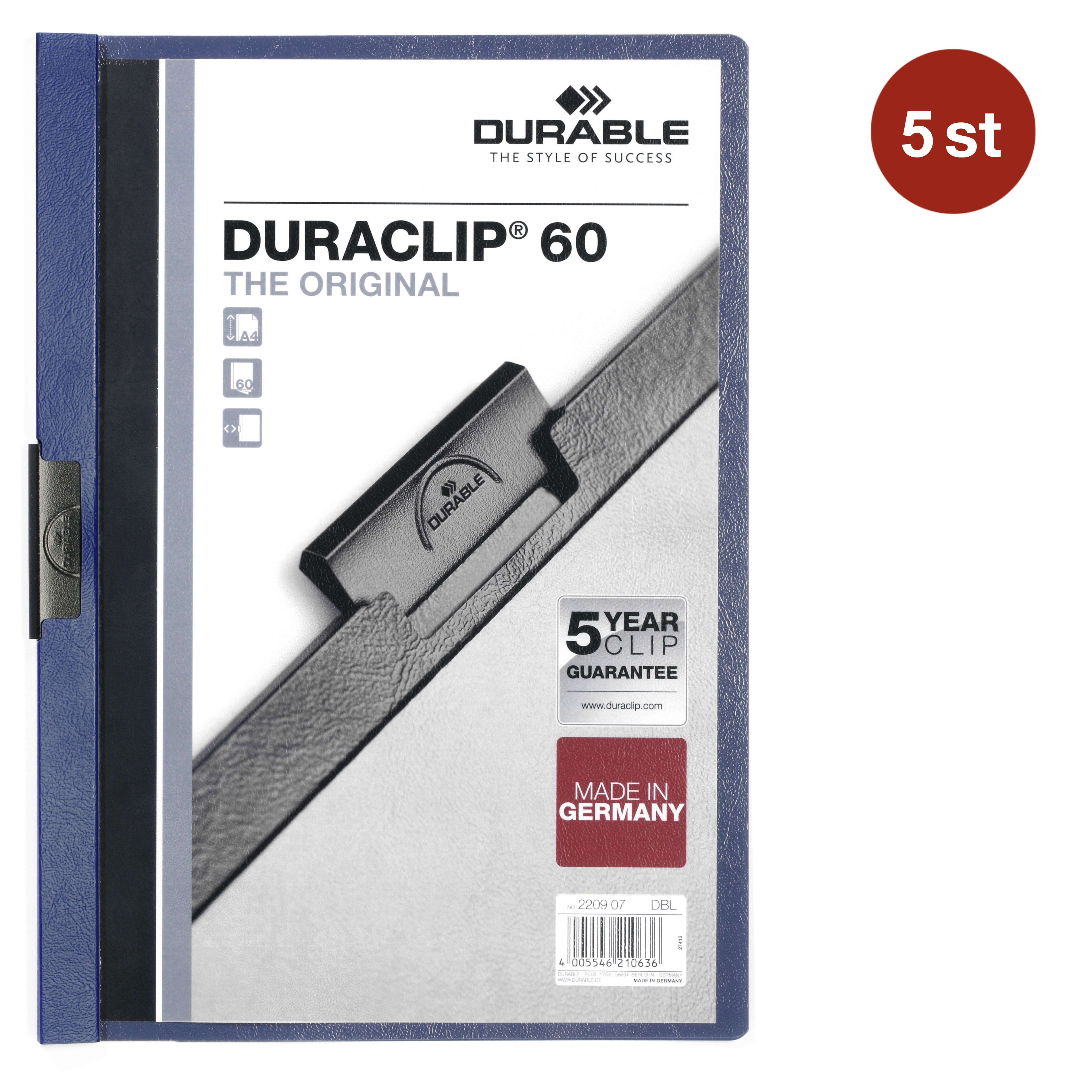 Varumärke Durable EAN 4005546223988 Typ Klämmappar Serie Duraclip Kategori Mappar Material Plast Färg Mörkblå Format A4 Antal st/fp 5 Storlek 21.9x31 cm Garanti 5 år Kapacitet 60 ark Tjocklek 8 mm - Produktblad