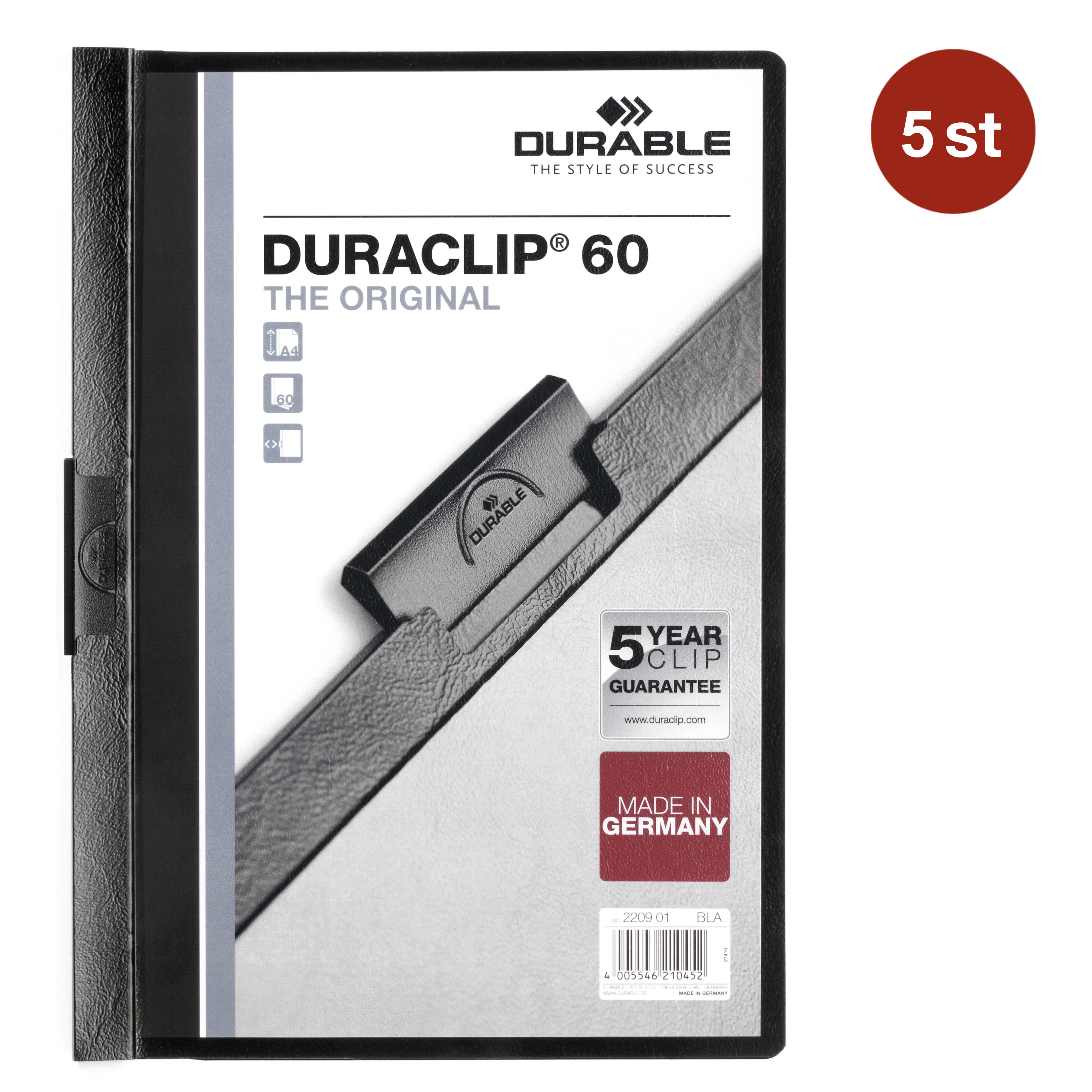 Varumärke Durable EAN 4005546224039 Typ Klämmappar Serie Duraclip Kategori Mappar Material Plast Färg Svart Format A4 Antal st/fp 5 Storlek 21.9x31 cm Garanti 5 år Kapacitet 60 ark Tjocklek 8 mm - Produktblad