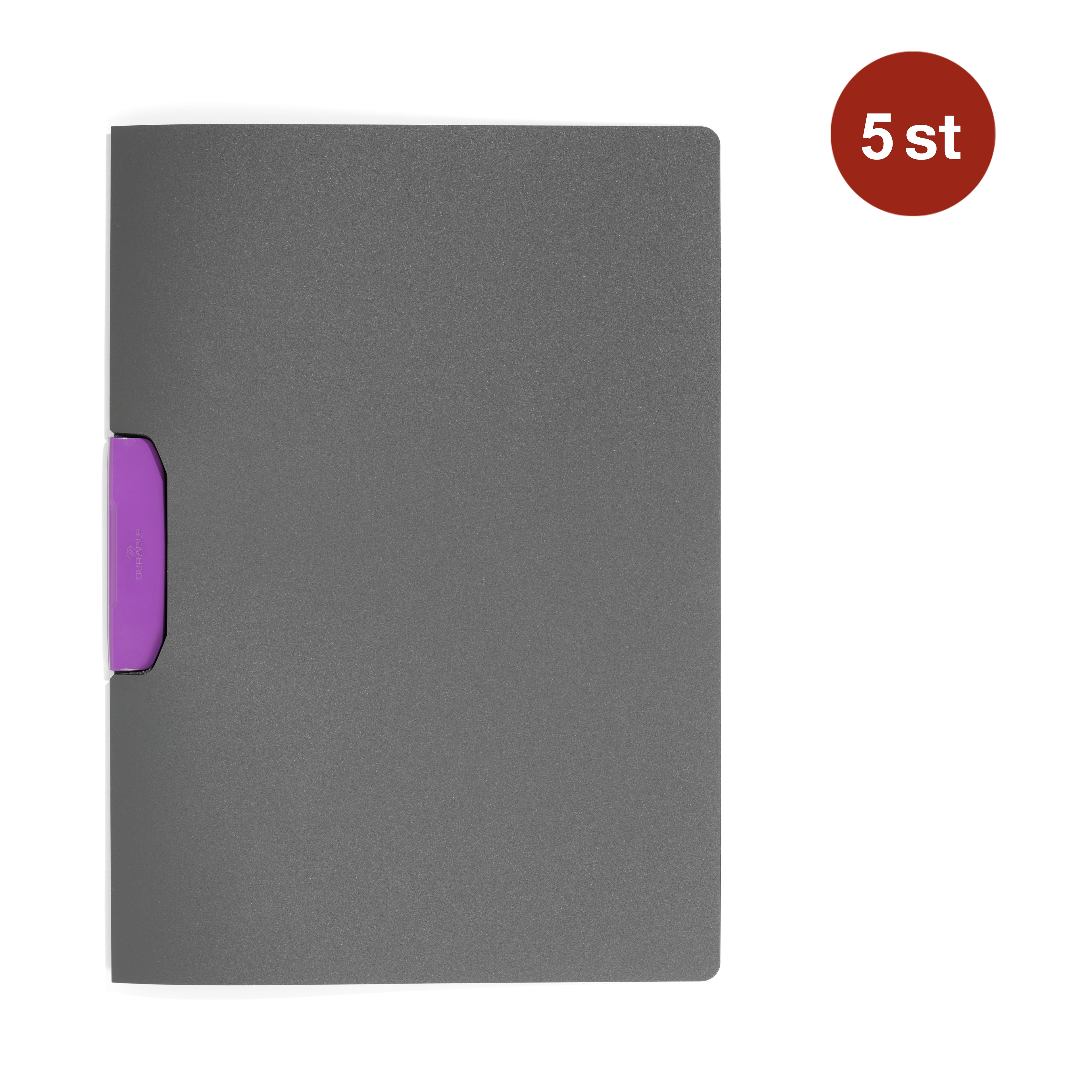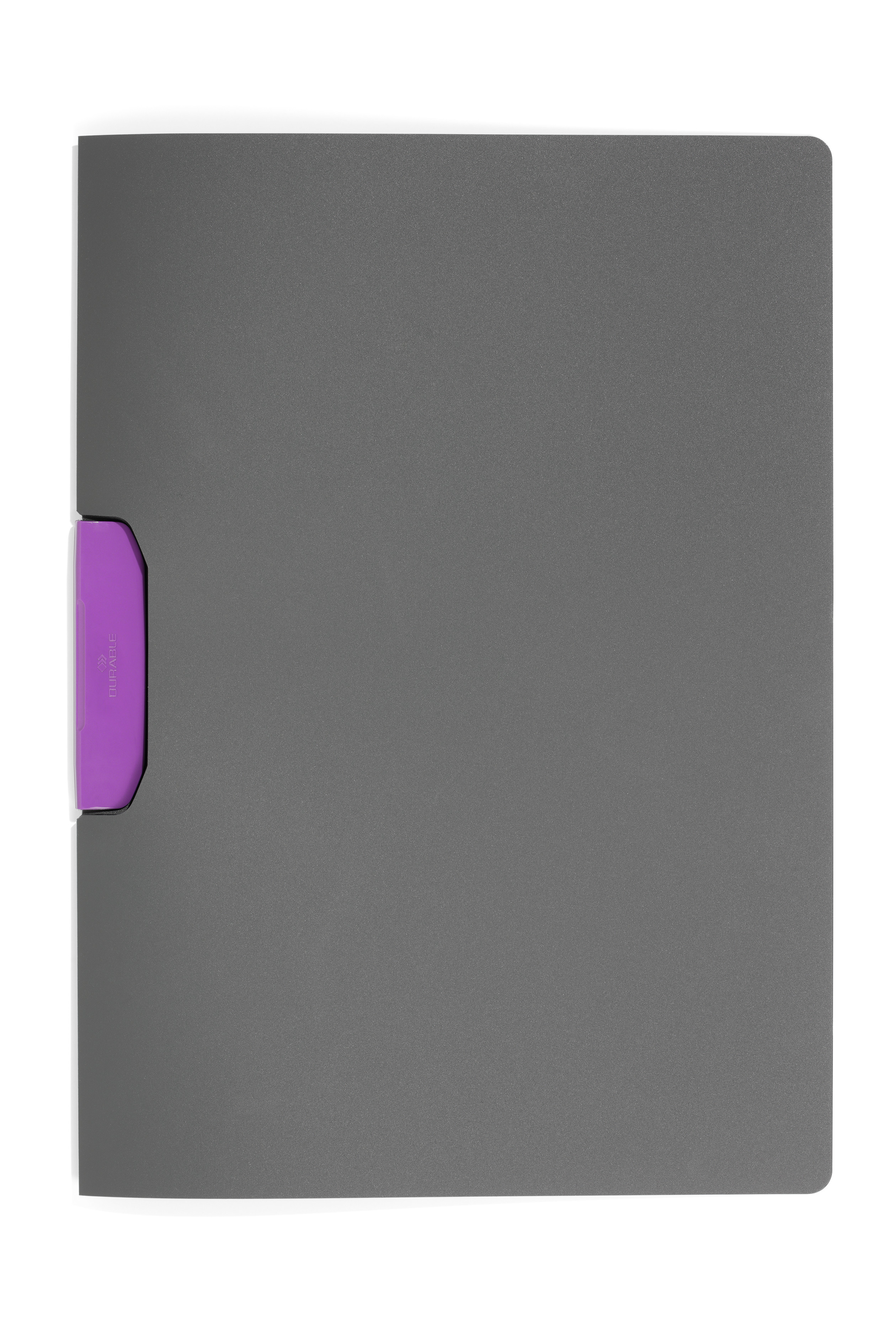 Klämmapp från Durable i serien Duraswing Color, tillverkad av ogenomskinlig polypropenfolie i antracitfärg och utrustad med en sidomonterad vridbar plastklämma i VARICOLOR®-färger. Den håller upp till 30 ark säkert på plats utan behov av hålslagning och är idealisk för offerter, möteshandlingar och utbildningsmaterial i A4-format.