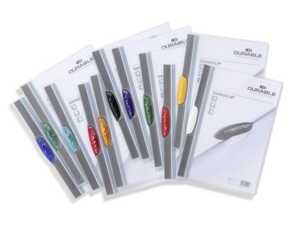 Klämmapp från Durable i serien Swingclip, tillverkad av flexibel polypropen och utrustad med en elliptisk, sidomonterad vridbar plastklämma för enkel och smidig hantering. Den transparenta designen tillsammans med den färgade klämman gör det lätt att identifiera innehållet och ger samtidigt ett modernt och professionellt utseende för A4-dokument som offerter, möteshandlingar och utbildningsmaterial.