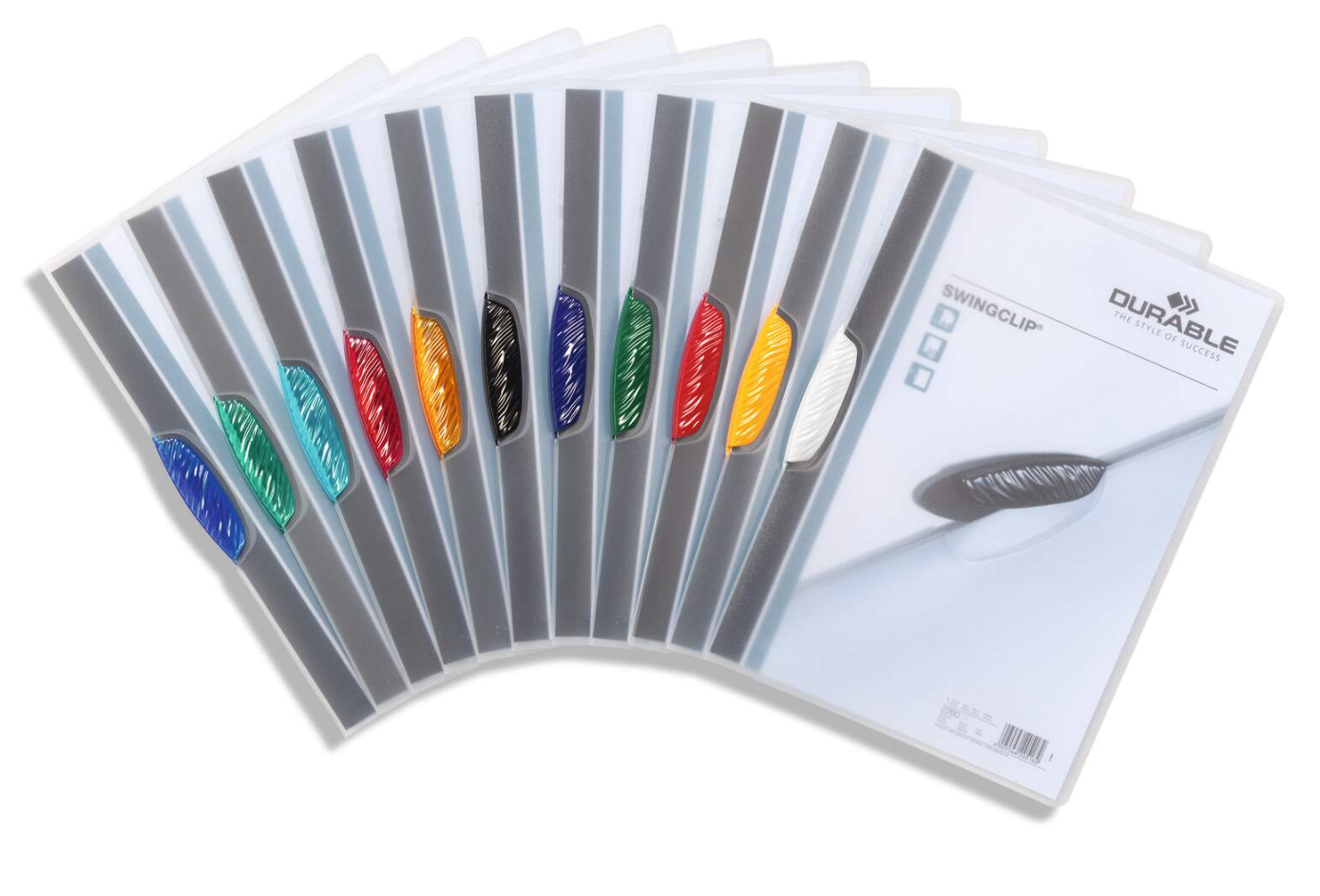 Klämmapp från Durable i serien Swingclip, tillverkad av flexibel polypropen och utrustad med en elliptisk, sidomonterad vridbar plastklämma för enkel och smidig hantering. Den transparenta designen tillsammans med den färgade klämman gör det lätt att identifiera innehållet och ger samtidigt ett modernt och professionellt utseende för A4-dokument som offerter, möteshandlingar och utbildningsmaterial.