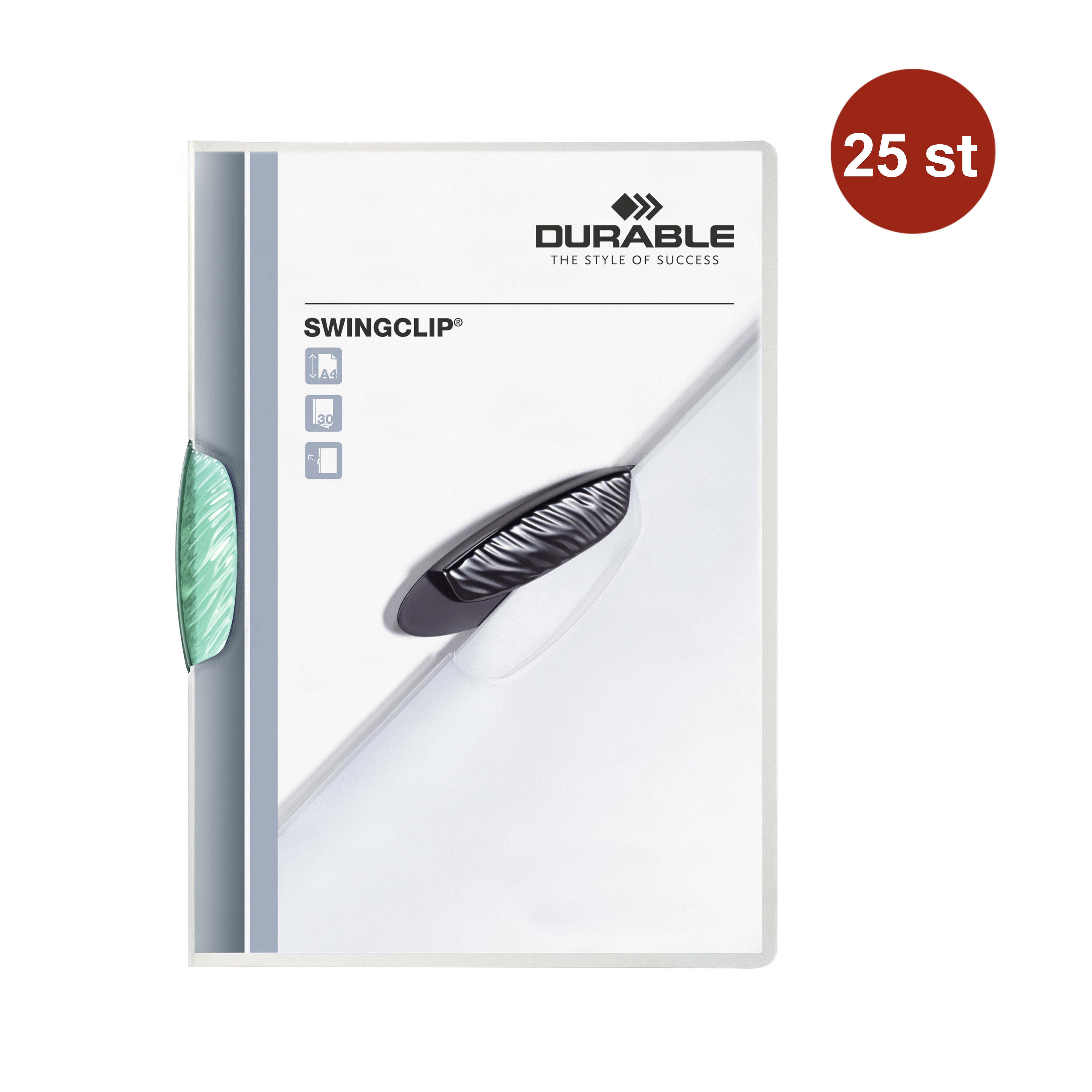 Varumärke Durable EAN 4005546208831 Typ Klämmappar Serie Swingclip Kategori Mappar Material Plast, Polypropylen Färg Petrolgrön Format A4 Antal st/fp 25 Storlek 21.8x30.6 cm Kapacitet 30 ark Tjocklek 8 mm - Produktblad