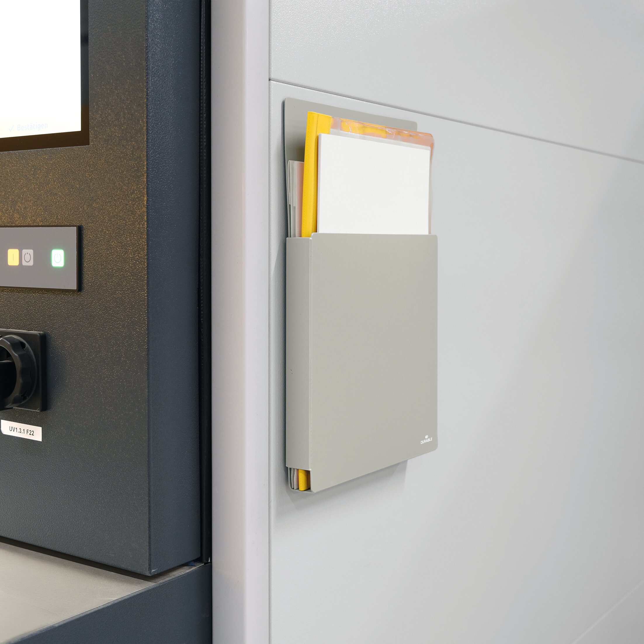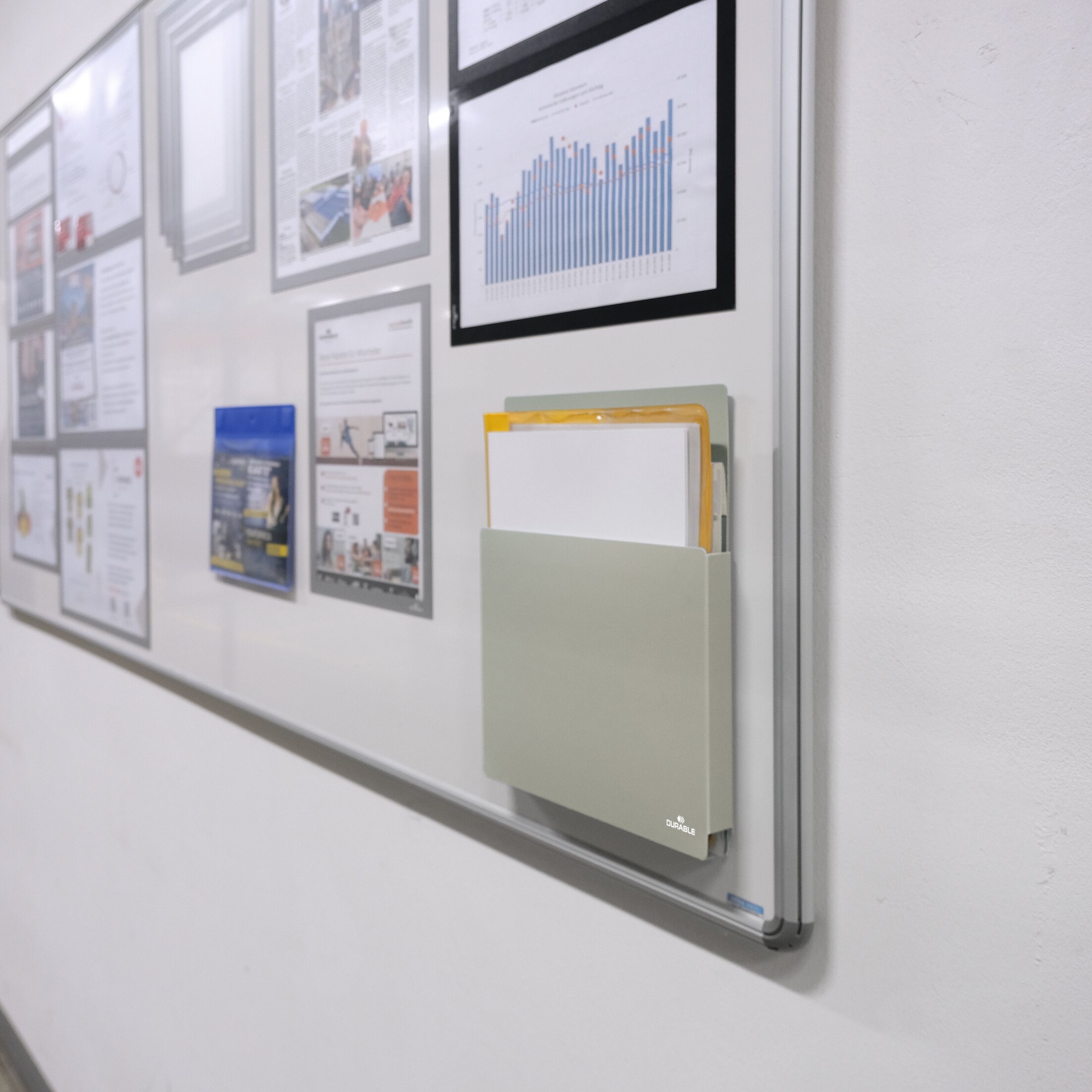 Den magnetiska baksidan gör det enkelt att fästa facket på exempelvis whiteboardtavlor eller skyltställ utan behov av verktyg. Facket rymmer dokumentbuntar upp till 22 mm och har en hög lastkapacitet.