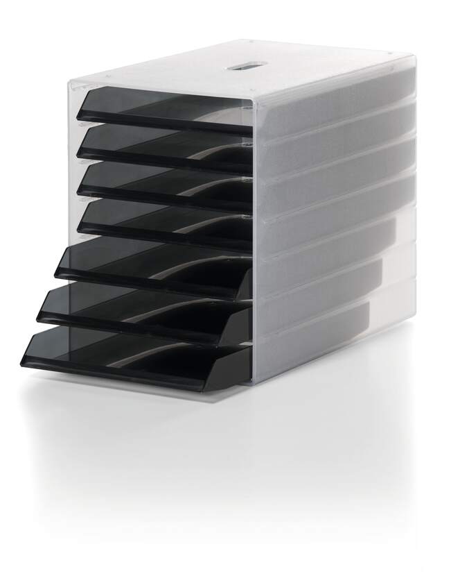Blankettbox med sju öppna lådor som är utformad för att organisera dokument i upp till C4-format på ett överskådligt och praktiskt sätt. Boxen passar utmärkt på skrivbord، i kontorsskåp، på bänkar och hyllor. De sju lådorna kan tas bort och placeras om efter behov، vilket gör det enkelt att anpassa systemet för olika dokumentstorlekar och arbetsflöden. Transparent hölje ger god överblick över innehållet, medan lådornas transparenta antracitfärg ger en stilren kontrast och professionellt intryck.
