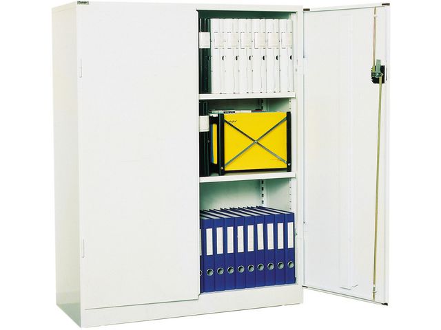 Detta standardskåp är tillverkat av en 1 mm tjock lackerad stålplatta som ger hållbarhet och styrka. Med två justerbara hyllor gör det enkelt att förvara olika pärmar och gaffelpärmar.