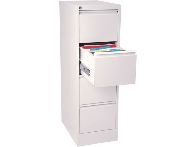 Det här arkivskåpet är lämpligt för arkivering av dokument och kontorsmaterial i hemmet och på kontoret. Skåpet har fyra lådor med ett centrallåssystem och kan lagra officiella dokument på ett organiserat sätt. Det är tillverkat av lackerad stålplåt och låser de övriga lådorna när du öppnar en låda. Dessutom rymmer lådorna enkelt 260 filer och har dessutom tumhål för enkel hämtning - Centrallåsning, 2 nycklar ingår - Har tumhål - Rymmer 260 filer - Material: Lackerad stålplatta - Färg: Vit - Vikt: 51 kg - Tjocklek: 1 mm - Mått: 1,32 x 414 x 630 mm.