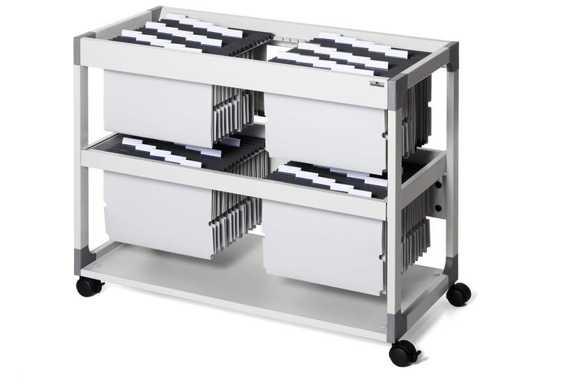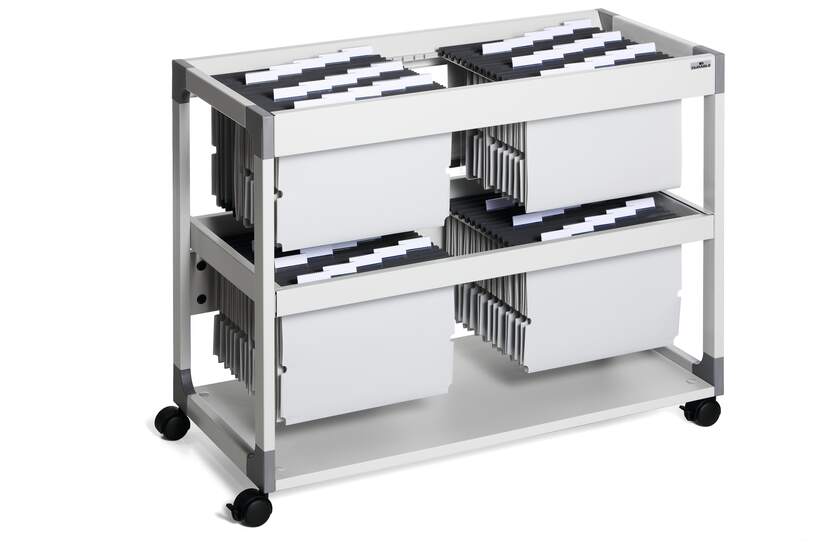 Arkivera och organisera dokument i hängmappar som förvaras i hängmappsvagnar med hjul. Hängmappsvagn i två plan som rymmer 200 st hängmappar i A4, folio och foolscap-format. Den nedre delen är utdragbar. Av metall med reptålig polyesterbeläggning. Bottenhylla. Vagnen är utrustad med 4 st svängbara länkhjul, varav 2 st har broms. Lätt att förflytta och stabil när den är "parkerad". Levereras i platt paket med monteringsanvisning. Mått:: 715 x 897 x 432 mm (HxBxD).