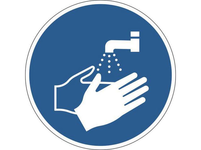 • Självhäftande golvdekal med påbud "Tvätta händerna", M011 enligt ISO 7010