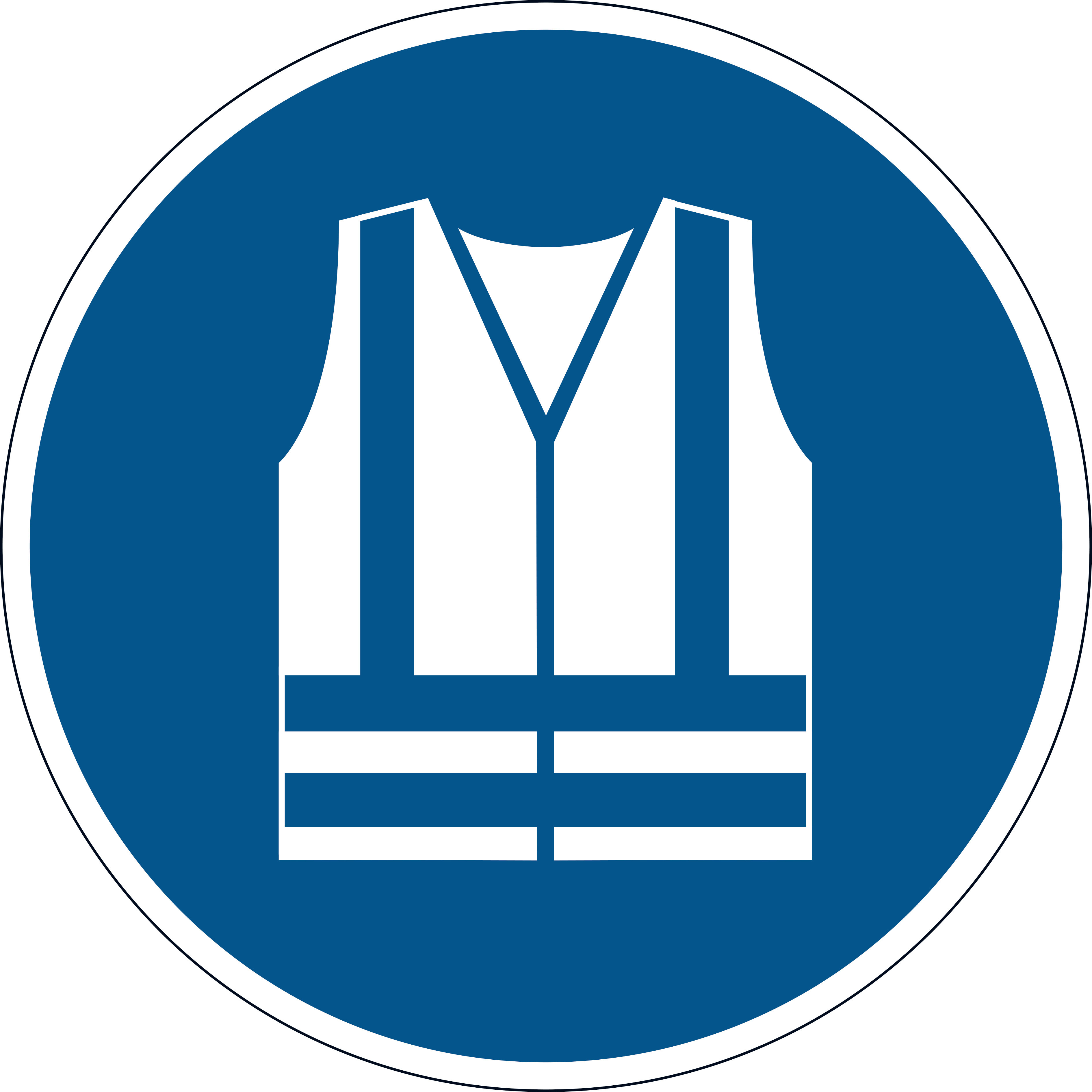 Självhäftande stor golvdekal "Använd varselkläder" upplyser tydligt besökare och personal att använda säkerhetsväst eller liknande för att synas ordentligt och minska risken för olyckor. Fäster på rena och torra betonggolv. Slitstark och tålig med halkskyddsgrad R9 i enlighet med DIN 51130. Skyltarna uppfyller kraven i ISO 7010. Mått: Ø 430 mm, tjocklek 0,4 mm