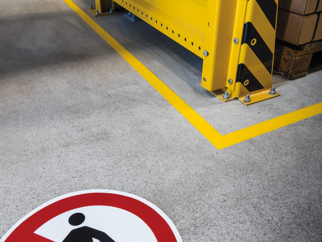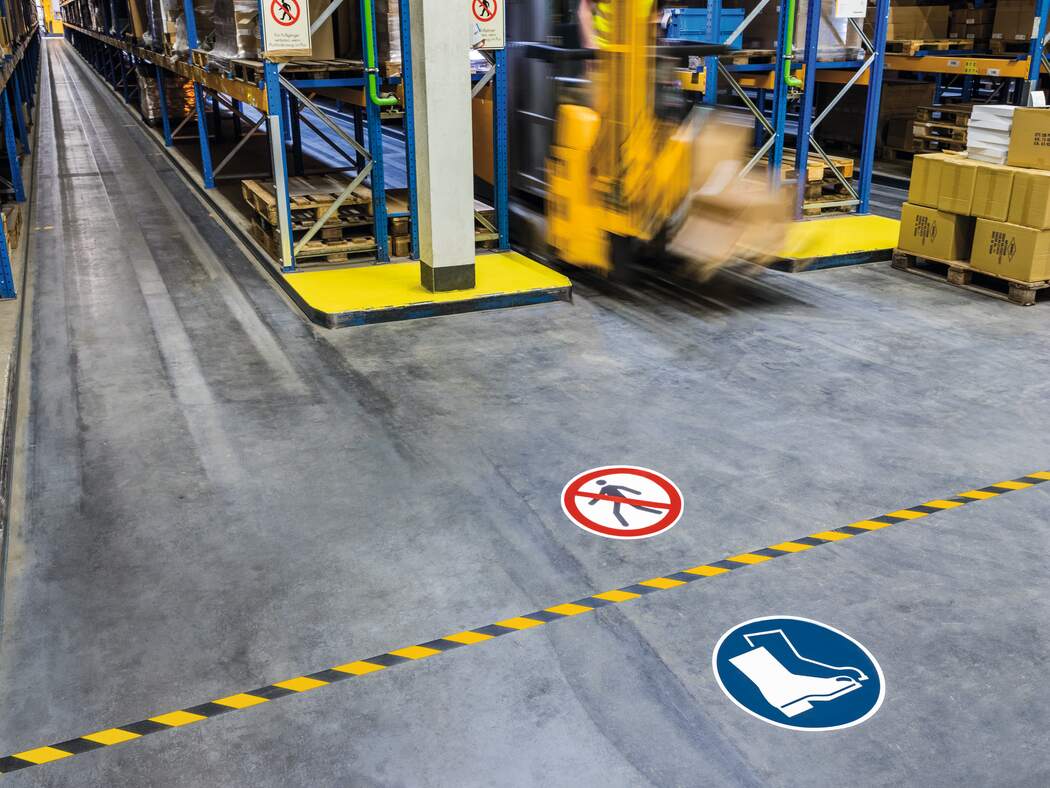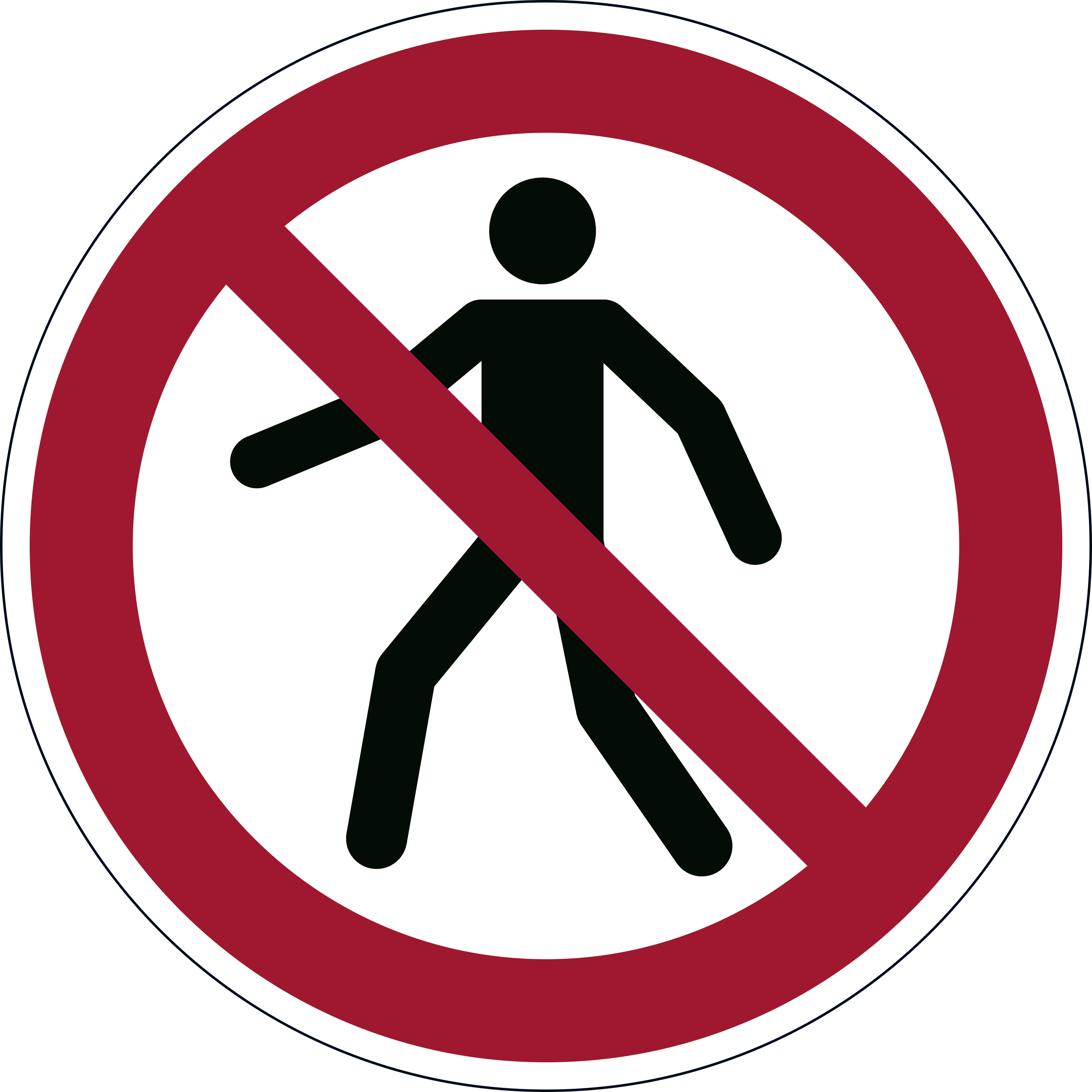 Självhäftande stor golvdekal "Förbjudet för gående" upplyser tydligt besökare och personal om gällande förbud för fotgängare och skapar en säkrare arbetsmiljö med minskad risk för olyckor. Fäster på rena och torra betonggolv. Slitstark och tålig med halkskyddsgrad R9 i enlighet med DIN 51130. Skyltarna uppfyller kraven i ISO 7010. Mått: Ø 430 mm, tjocklek 0,4 mm