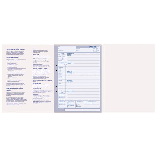 Byggarbetsplatsdagbok för dokumentation av entreprenader. AB 04 anger att entreprenören ska föra dagbok över omständigheter av betydelse för entreprenaden. Anteckningar som förs i dagboken är väderleksförhållanden, arbetsstyrka, direktiv, besiktningarpåbörjade arbeten, pågående arbeten, färdiga arbeten, avvikelser störningar och ändringar m m. Dagboken skrivs i rapportset om tre exemplar (original + 2 självkopierande kopior). Dagboken innehåller även SKYDDSRONDSRAPPORT som förs i rapportset om 3 exemplar (original + 2 självkopierande kopior.