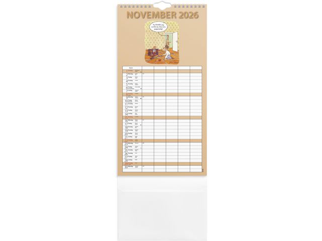 Kalender med fem kolumner för namn och anteckningar. En månad per blad. Spiralbunden med praktisk förvaringsficka i papper.