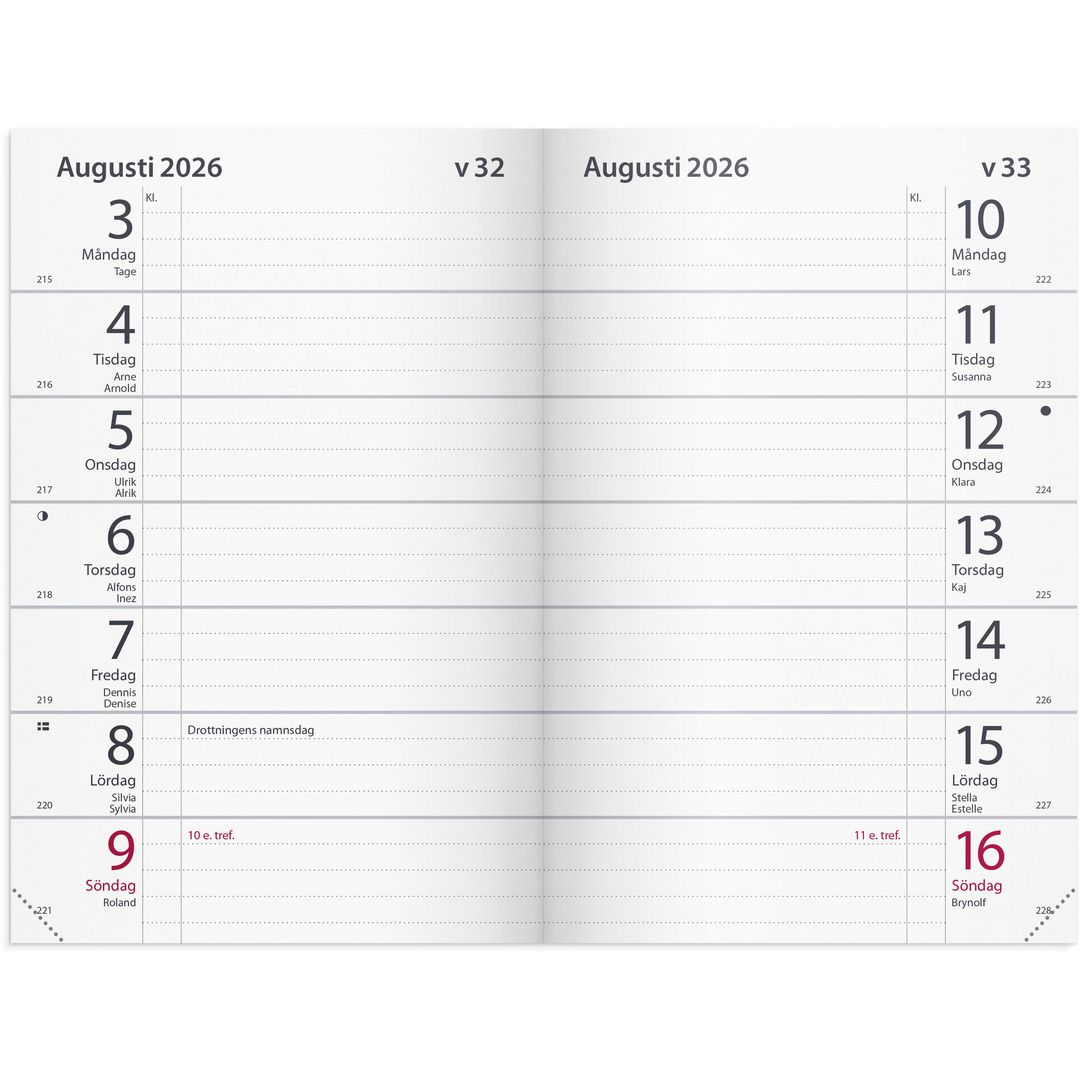 ● Layout: Liggande. Två veckor/uppslag