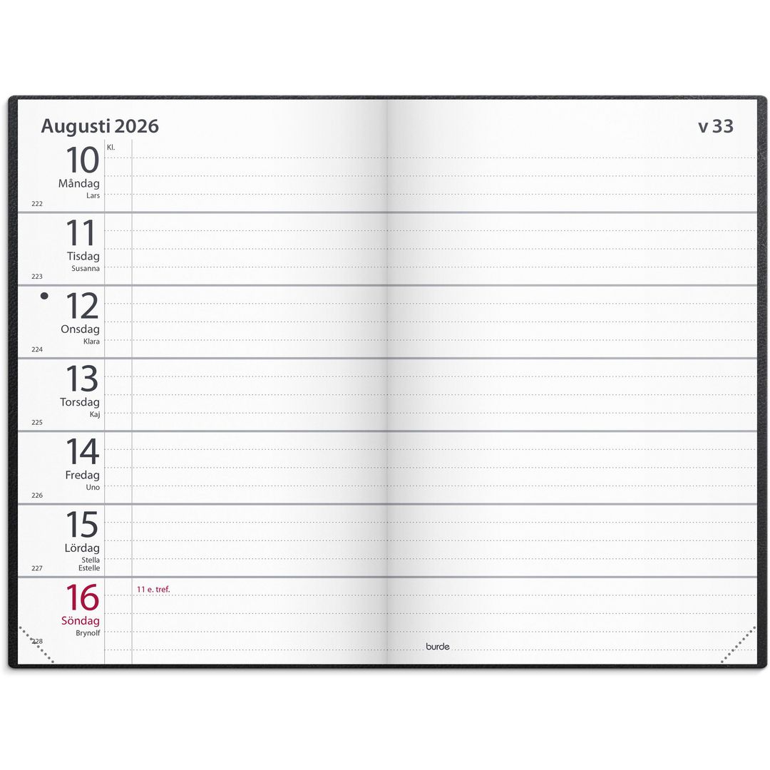 Varumärke Burde EAN 7333453332668 Typ Fickkalendrar Kategori Almanackor & Kalendrar Färg Svart Bredd 8.2 cm Längd 12.7 cm Blad 84 Omslagsmaterial Konstläder, Inbunden Sidor 168 -