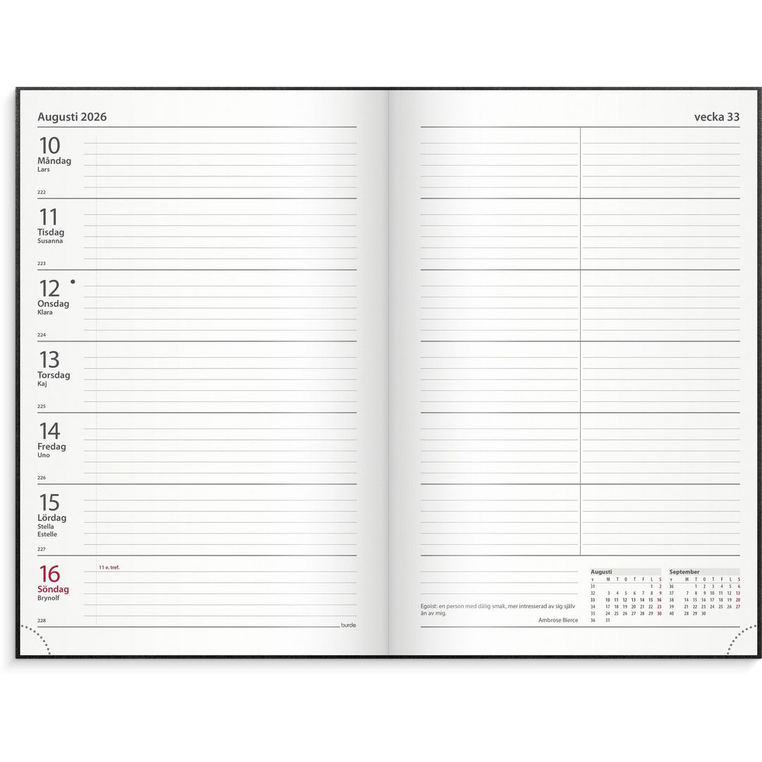 Inbunden kalender med en vecka per uppslag, praktiskt märkband samt årsplaner för innevarande och följande år.