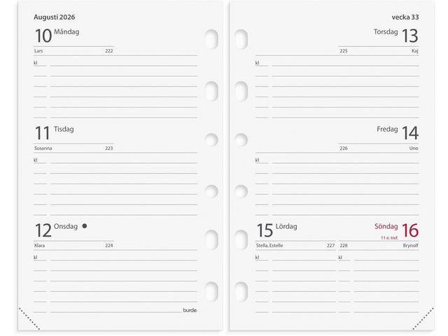 ● Innehåll: Budget, Kassabok, Kyrkliga helgdagar, Körjournal, Flaggdagar, Helgdagar/aftnar, Månfaser, Flyttbar markör/linjal, Namnsdagar, Anteckningssidor, Internationella helgdagar översikt, Projektarbete, Register a-ö, Flikregister, Telefonregister, Temadagar/händelser, To-do, Årsöversikt/årsöversikter, Årsplan/årsplaner