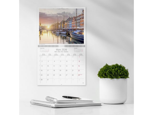 Väggkalender med tolv bilder från hela Skandinavien, den är femspråkig (svenska, engelska, danska, norska och finska).