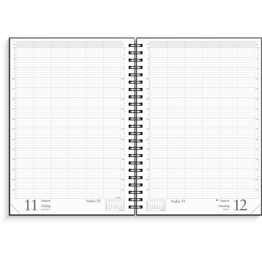 Spiralbunden kalender i svart kartong avsedd för tidsbokning, detaljerad tidsplanering etc. En dag per sida med kvartsindelning 7-21. Liten månadsöversikt på varje sida och sex fria kolumner. Årsplaner för innevarande och följande år.