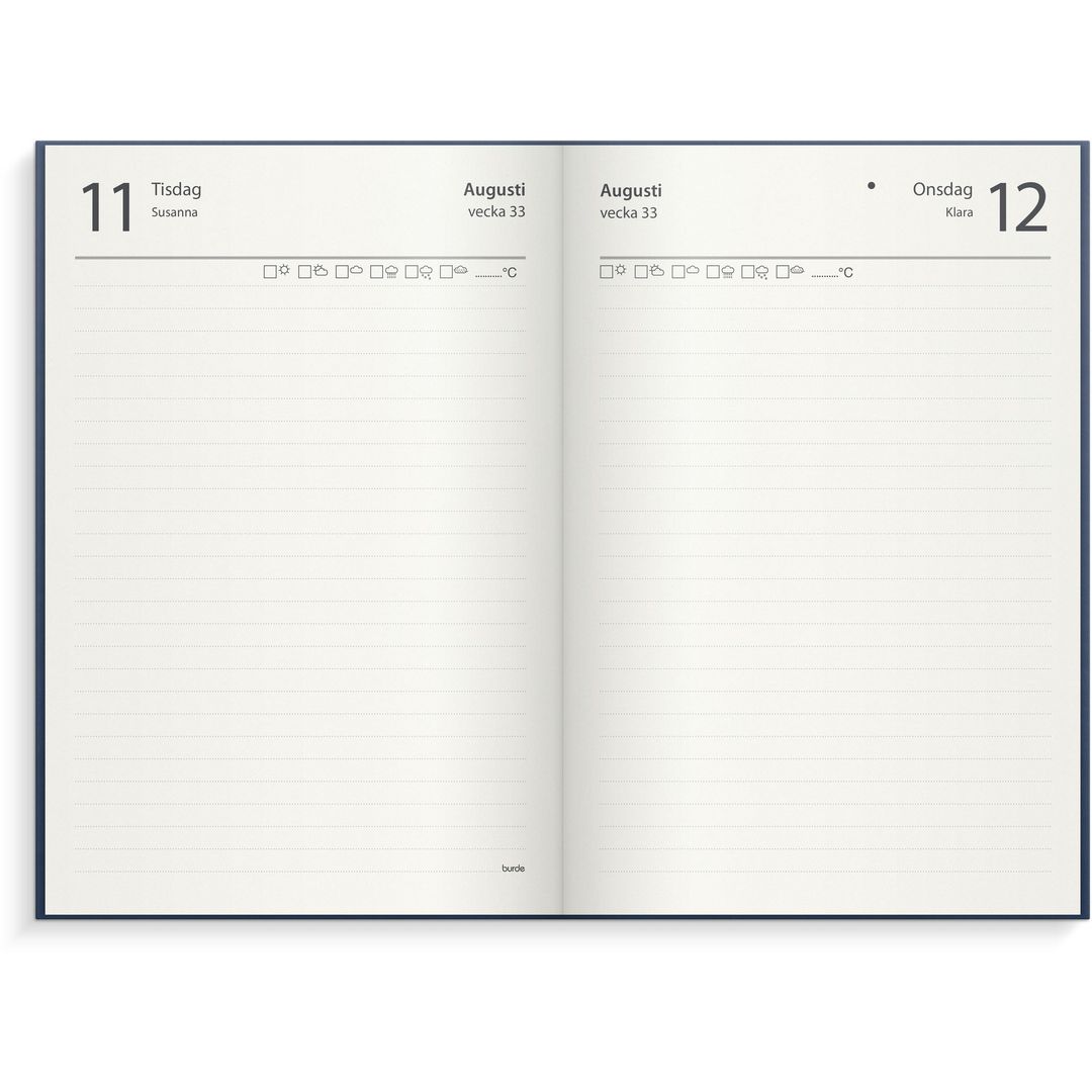 Varumärke Burde EAN 7333453109963 Typ Dagböcker Kategori Almanackor & Kalendrar Färg Blå Bredd 14.2 cm Längd 20.5 cm Blad 192 Omslagsmaterial Konstläder, Inbunden Sidor 384 -
