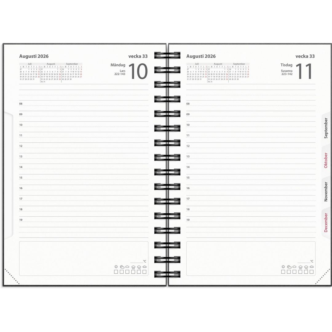 En dag per sida, timindelad 8-19. Årsplaner för innevarande och följande år. Urstansat månadsregister.