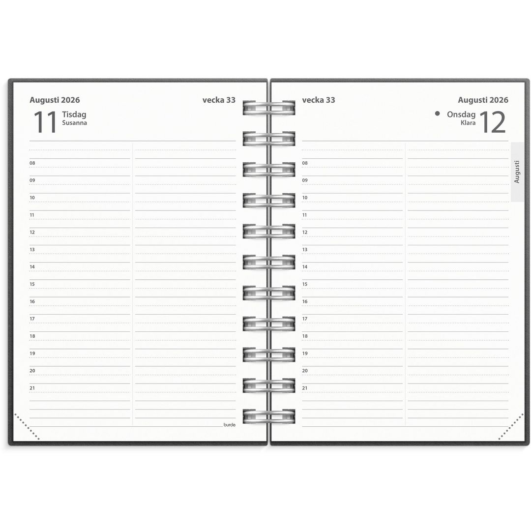 En dag per sida, timindelad 8-21. Årsplaner för innevarande och följande år.