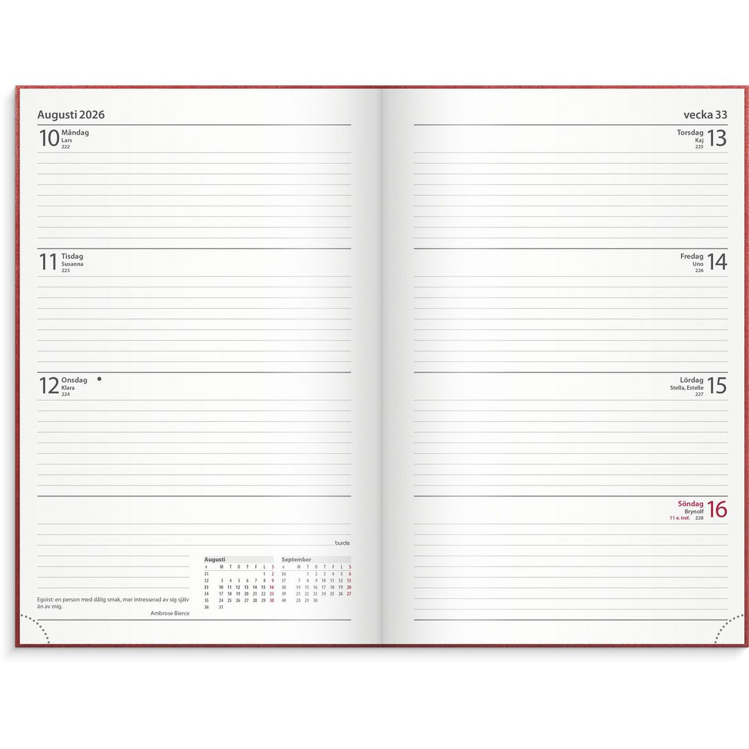 Varumärke Burde EAN 7333453108768 Typ Veckokalendrar Kategori Almanackor & Kalendrar Färg Röd Bredd 15 cm Längd 23 cm Blad 64 Omslagsmaterial Konstläder, Inbunden Sidor 128  -
