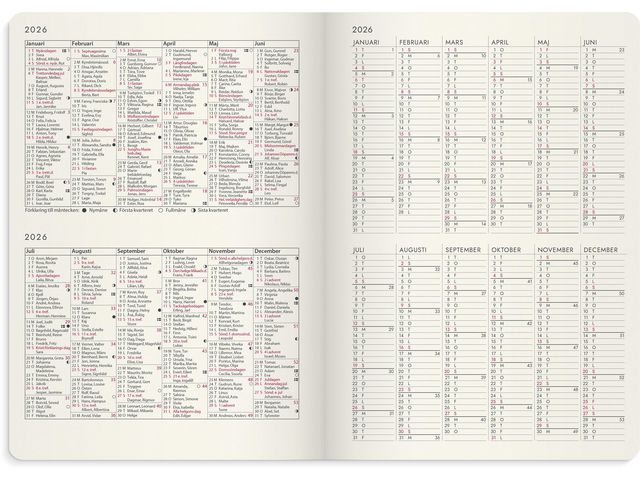 ● Innehåll: Flaggdagar, Helgdagar/aftnar, Månfaser, Namnsdagar, Anteckningssidor rutiga, Anteckningssidor linjerade, Anteckningssidor olinjerade, Temadagar/händelser, Årsplan/årsplaner