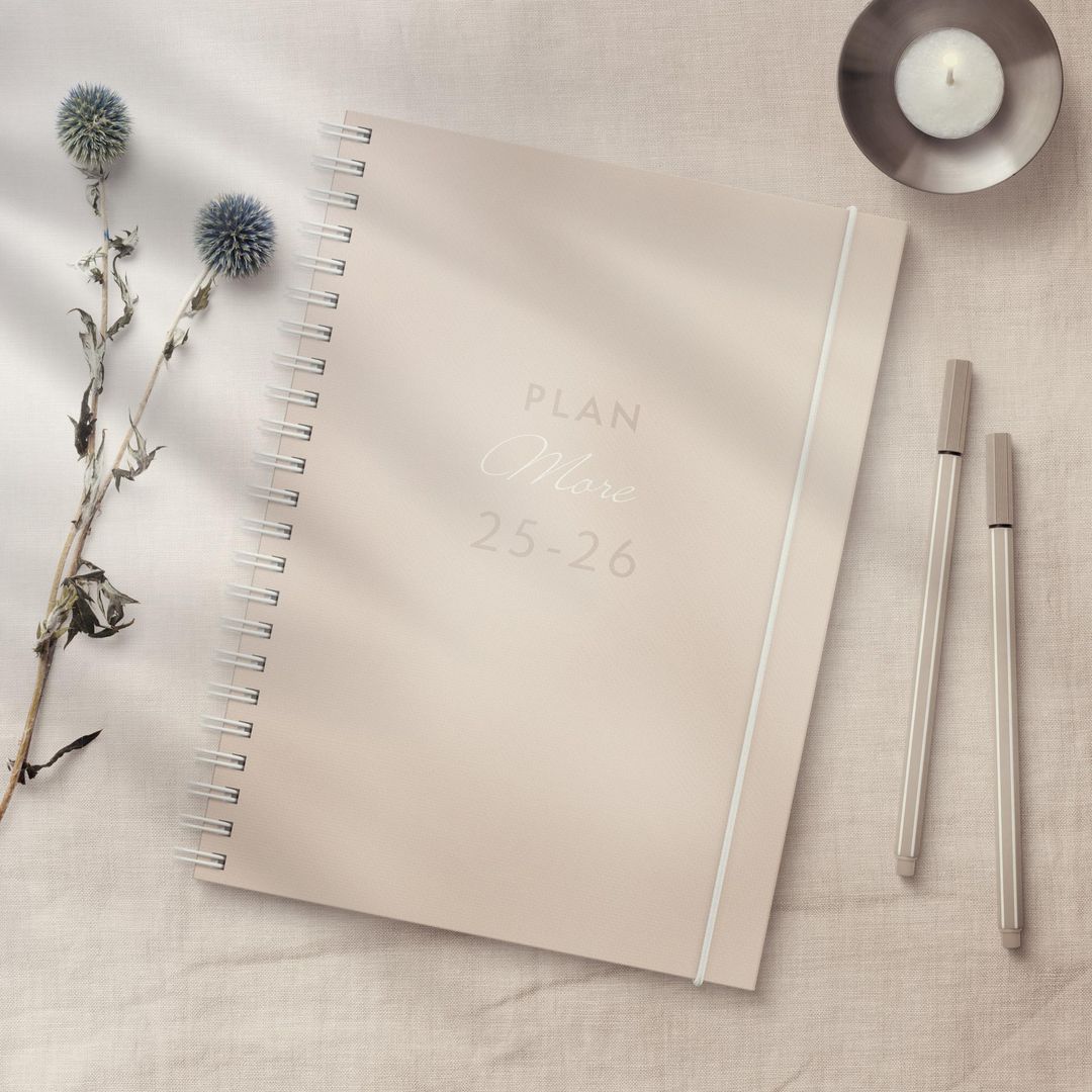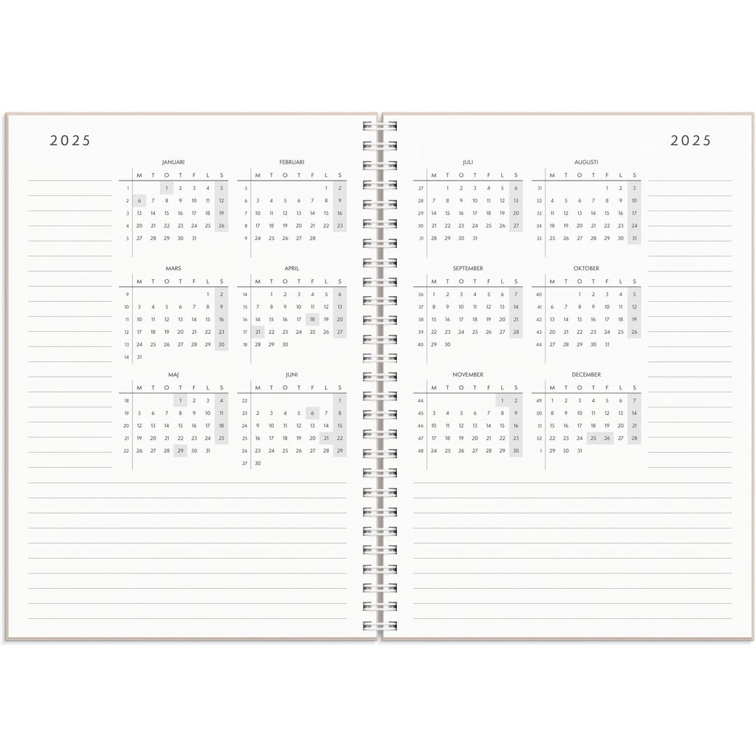 Har du många bollar i luften? Konstant många projekt på gång? Då är Plan More perfekt! En A5 veckokalender med en horisontell layout. Med 6 kolumner för varje dag blir det enkelt att få struktur på planering och produktivitet. En tydlig årsöversikt med extra anteckningsmöjligheter och utrymme för att anteckna viktiga datum förenklar prioritering över hela året. Kalendern har även extra linjerade och blanka anteckningssidor för när inspirationen slår till. Allt är paketerat i en lyxig strukturerad kartong i en neutralt ljus ton med stilfull inskription.