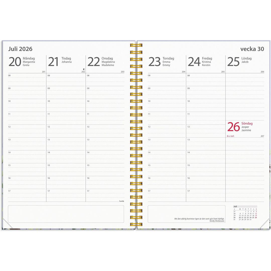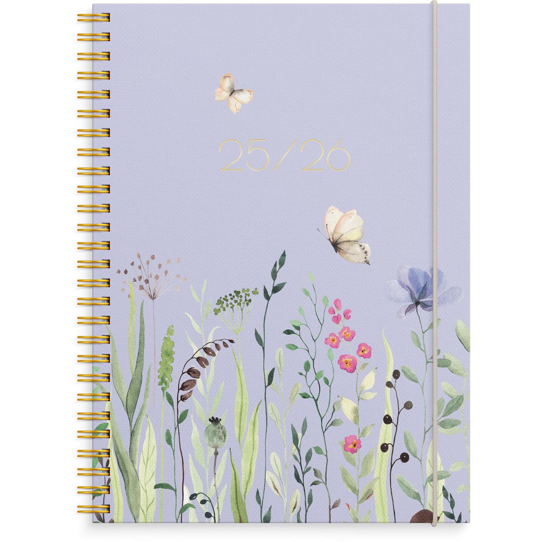 Study A5 är en praktisk kalender för den studerande. Med ett tryckt kartongomslag och en inlaga med stående layout samt timindelning 8-17 hjälper Study dig att behålla strukturen genom hela läsåret. Det finns även utrymme för att skriva upp årsplaner, scheman och provresultat för att lättare kunna reflektera över akademisk utveckling. För att underlätta organiseringen har Study även en praktisk förvaringsficka. Allt du behöver för ett framgångsrikt läsår! Story Äng är ett omslag i en tidsenlig dimmig lavendel färg med vackert målade blommor längs sidan likt en trolsk sommaräng. Gyllene detaljer ger kalendern en vintage look med en extra tvist.