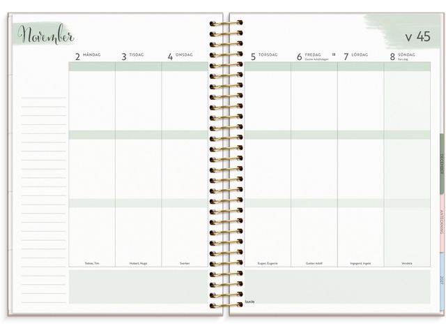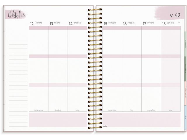● Innehåll: Flaggdagar, Helgdagar/aftnar, Månfaser, Namnsdagar, Anteckningssidor, Stickersark, Temadagar/händelser, Årsöversikt/årsöversikter, Årsplan/årsplaner