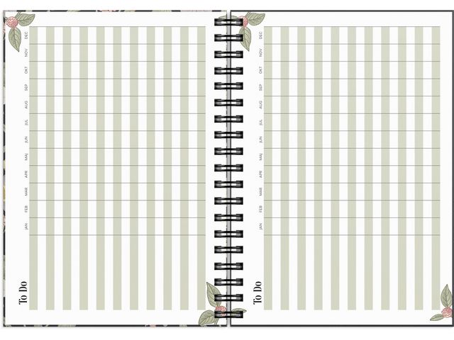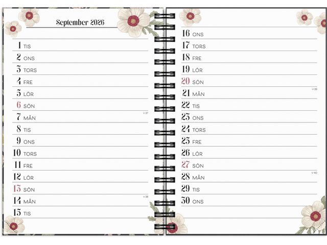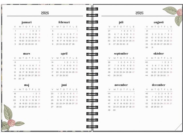● Innehåll: Flaggdagar, Helgdagar/aftnar, Månadsöversikt, Månadens to-do lista, Månfaser, Namnsdagar, Anteckningssidor linjerade, Citat, Temadagar/händelser, To-do, Årsöversikt/årsöversikter