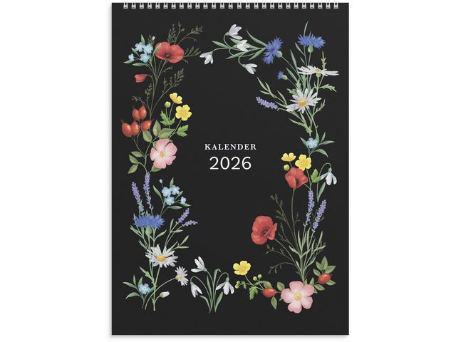 Väggkalender med illustrationer från naturen. Det vackert illustrerade motivet syns tydligt mot den svarta bakgrunden och blir som en tavla. I månadskalendariet finns möjlighet att anteckna.