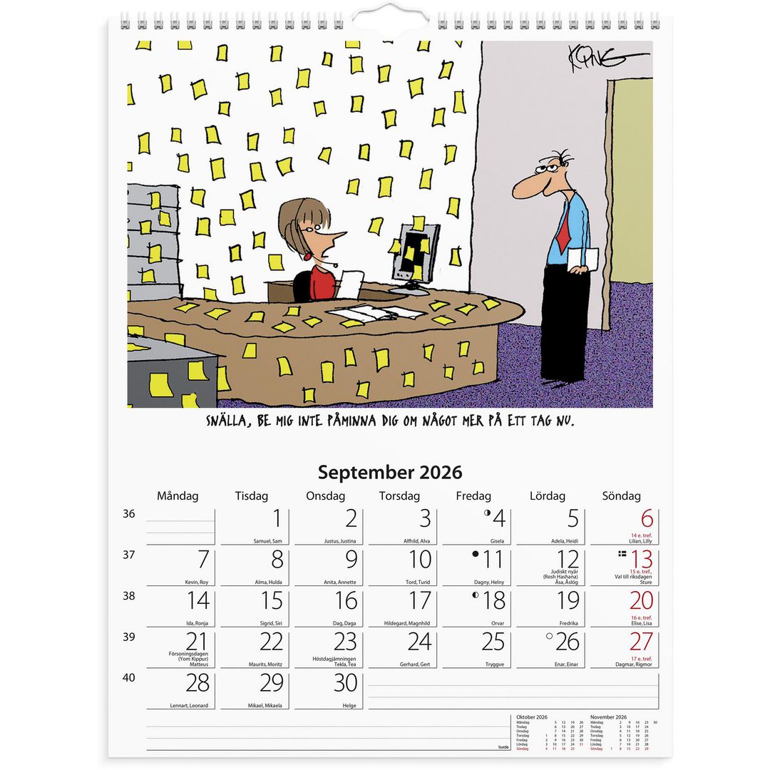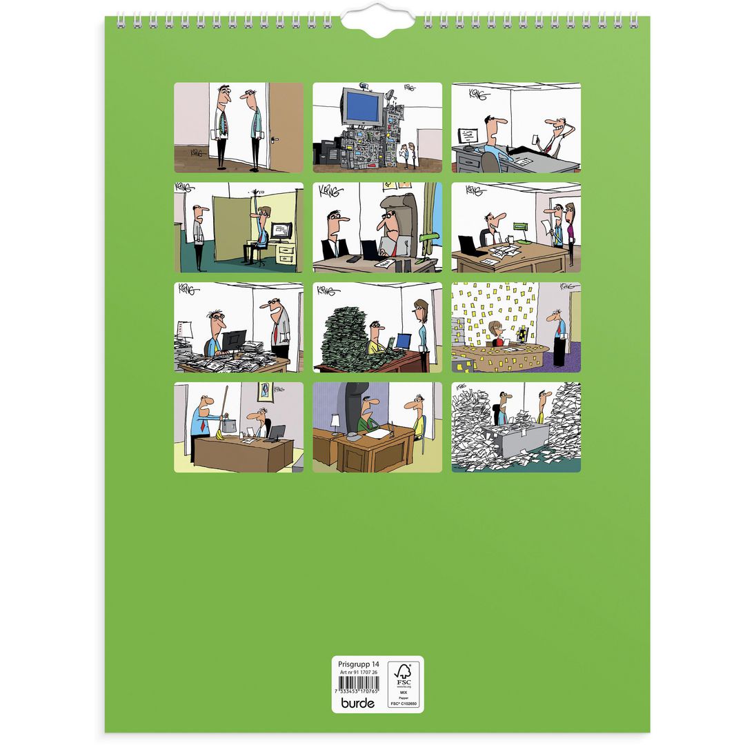 Tolv humoristiska illustrationer från kontorsvärlden. En månad per blad.