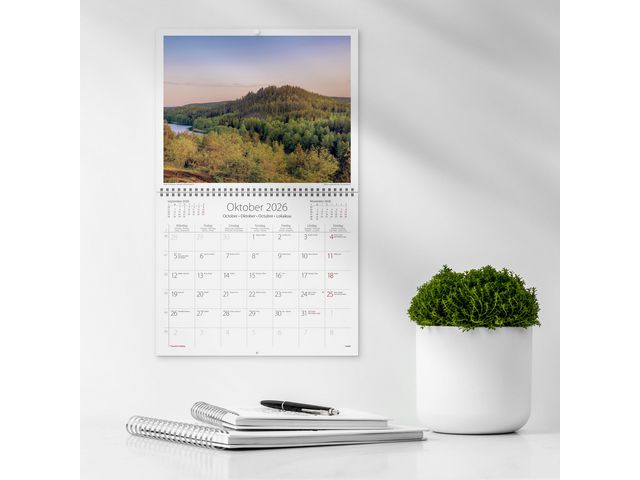 Väggkalender med tolv bilder från svensk natur, den är femspråkig (svenska, engelska, tyska, spanska och finska) och har svenska namnsdagar. Ett kuvert följer med så väggkalendern lätt kan skickas iväg som en fin present!