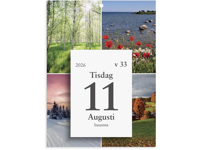 Följ året genom att riva av blad efter blad. Kalendern har ett väggplån som bakstycke med bilder på de fyra årstiderna och ett dagblock. Dagblocket har en vardag per blad och lördag och söndag på samma blad och är limbundet med klammerbaksida.