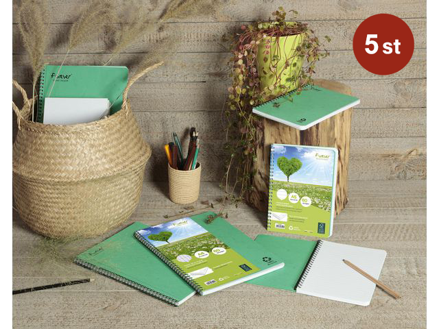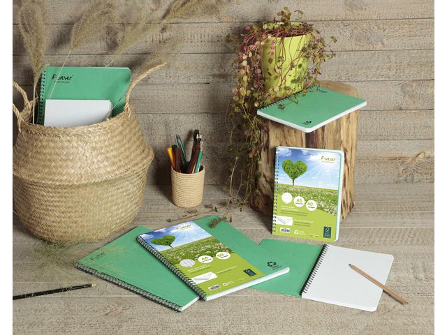 FOREVER premium, 100% återvunnen trådbunden A4 notebook. Anteckningsblock i format A4 med 60 löstagbara mikroperforerade ark fodrade grönt. Djupt färgat återvunnet pressboardskydd. Premium satinfinish.