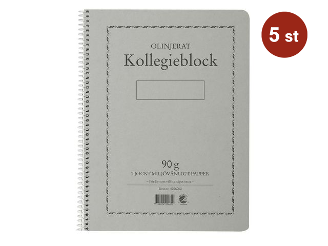 EAN 7319024206002 Typ Kollegieblock Material Träfritt papper Färg Grå Bredd 21 cm Längd 29.7 cm Format A4 Antal st/fp 5 Blad 70 -