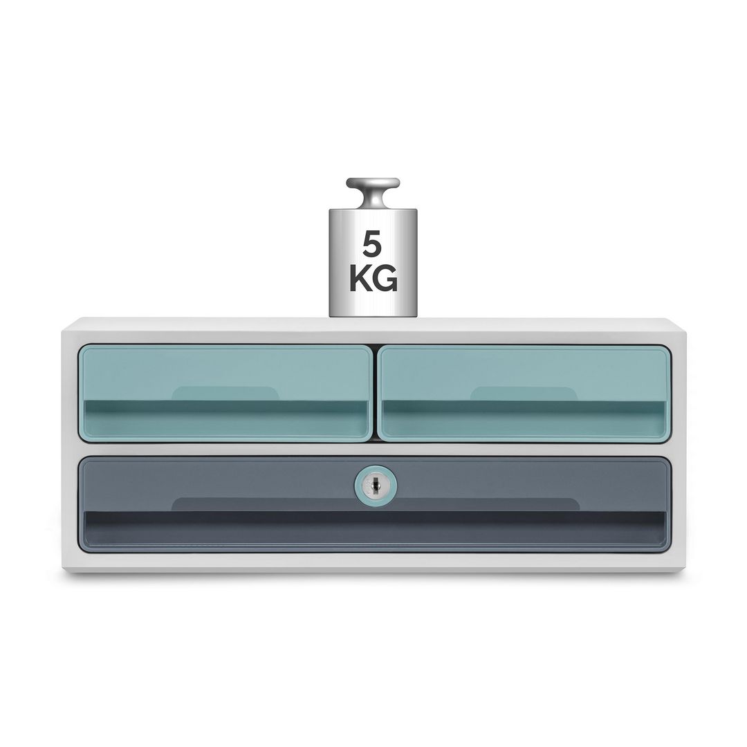 Lådsystemet har tre lådor som alla kan låsas med en och samma nyckel. Två mindre lådor passar utmärkt för skrivredskap och kontorstillbehör, medan den större lådan har gott om plats för dokument, gummibandsmappar, surfplattor samt bärbara datorer upp till 14 tum.