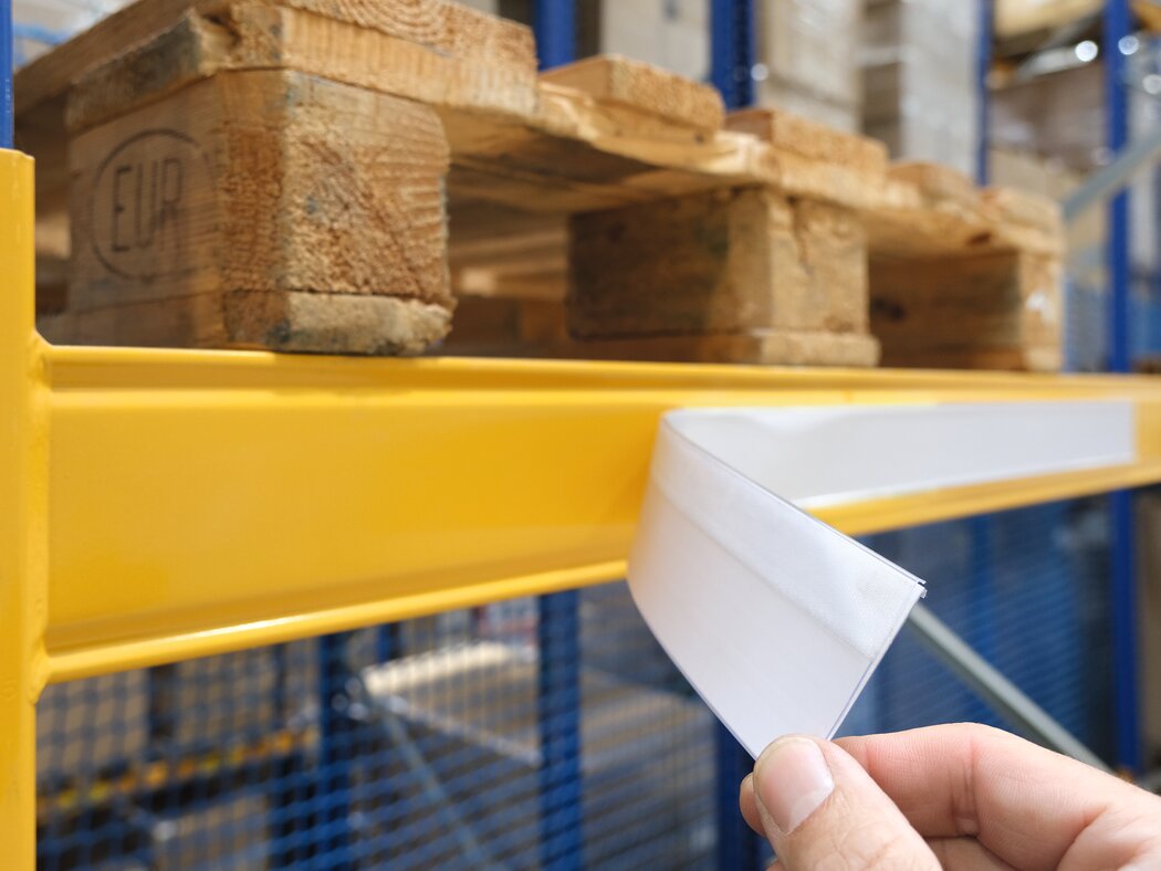 Självhäftande etiketthållare SCANFIX® för uppmärkning och skanning av t ex priser och streckkoder på hyllkanter, pallställ och lagerlådor. Vita etikettremsor kommer med och hållaren kan klippas till önskad längd. Öppen upptill och på sidan vilket gör dem passande för etiketter som måste bytas ofta.