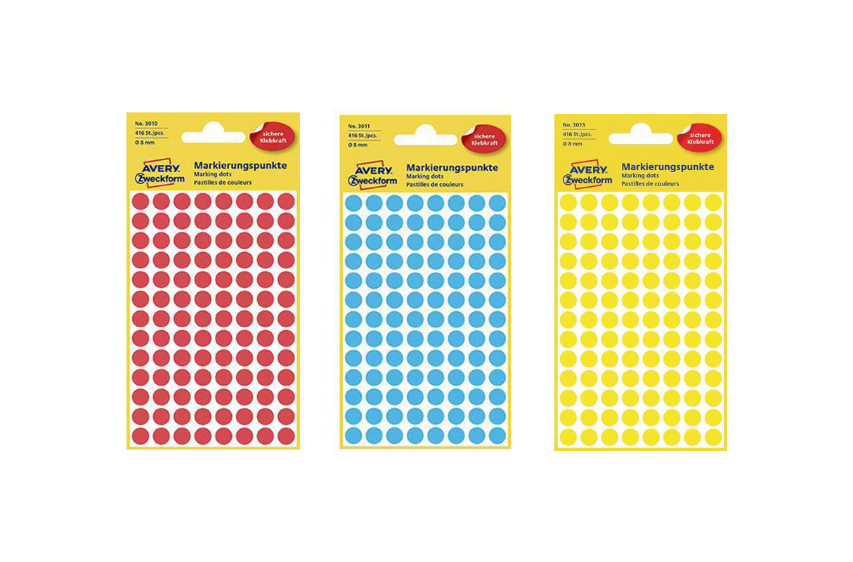 Varumärke Avery Typ Färgkodningsprick Färg Blå, Gul, Röd Diameter 8 mm Antal st/fp 416 Användning Färgkodning är lätta att använda och har många användningsområden -